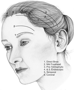 There are different types of brow lift surgery. The coronal lift and modifications, the direct brow lift and modifications, and the endoscopic brow lift, the trichophytic brow lift, and the temporal brow lift. The incisions for each of these surgeries are shown below.