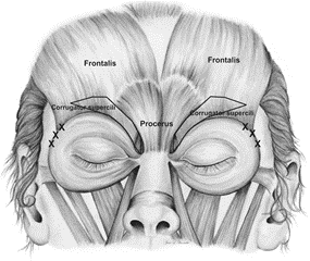 Wrinkles and frown lines can be caused by the muscles of the forehead, as shown below. The predominant muscle of the forehead is the anterior belly of the frontalis muscle. The vertical orientation of the frontalis muscle creates the transversely oriented wrinkles. The primary brow elevator is the frontalis muscle. Brow depressors include the paired corrugator supercilii, procerus, and orbicularis oculi muscles. The corrugator supercilii muscles form the glabellar vertical rhytids and the procerus muscle forms the transverse glabellar rhytids. Lateral rhytids at the lateral canthus, otherwise known as crow’s feet, appear secondary to orbicularis oculi contraction.