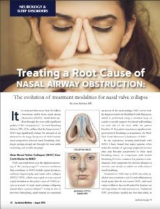 It is estimated that more than 20 million Americans suffer from nasal airway obstruction (NAO), which limits airflow through the nose with significant quality of life consequences.2 As nasal breathing delivers 70% of the airflow that the lungs receive, NAO may significantly reduce the amount of air delivered to the lungs. Symptoms of NAO include nasal congestion, labored nasal breathing, challenges getting enough air through the nose while exercising, and trouble sleeping. – An excerpt from the article. Read more here