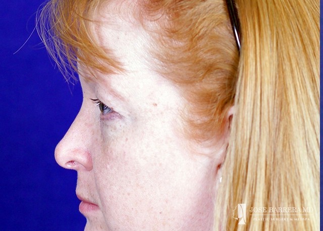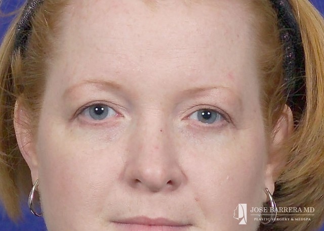 Patient with heavy upper eyelids and excessive skin in the upper eyelids. The lower eyelids also were full with pseudo herniated fat and prominent tear troughs. An upper and lower eyelid surgery was performed to improve her dermatochalasis and fat pad herniation.
