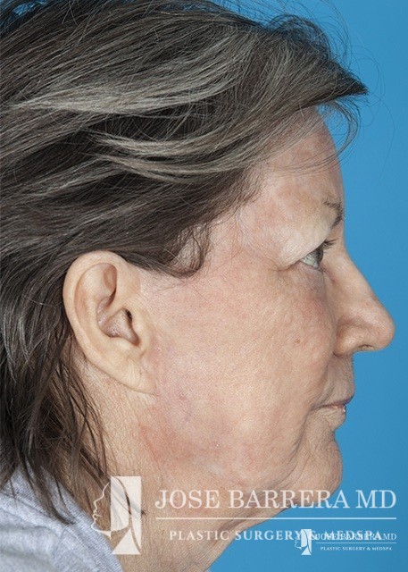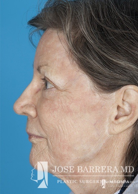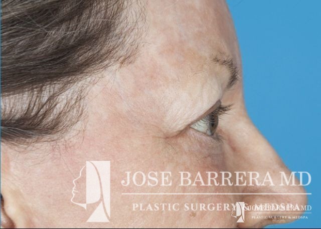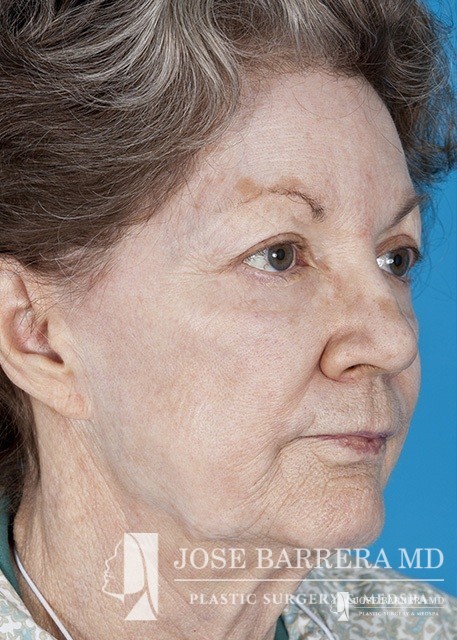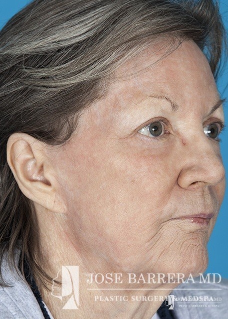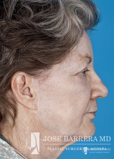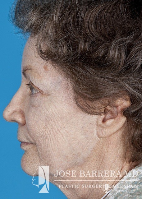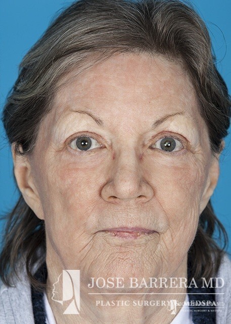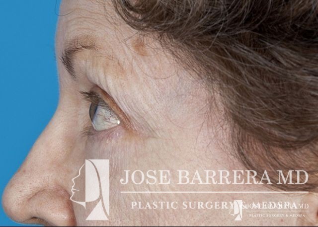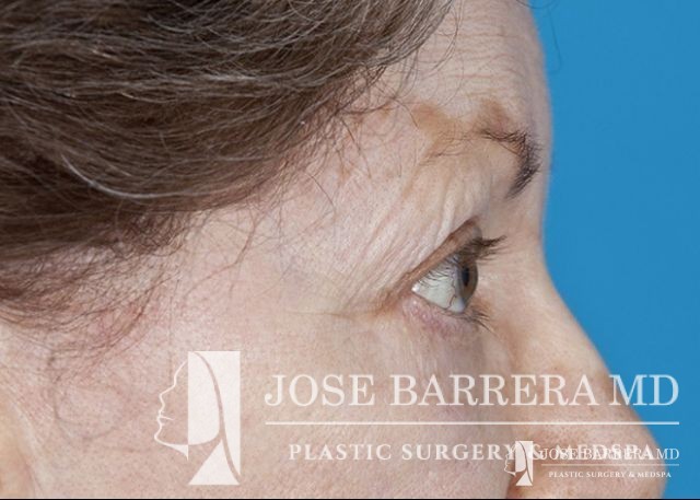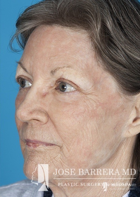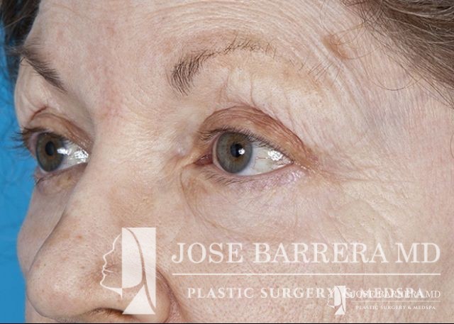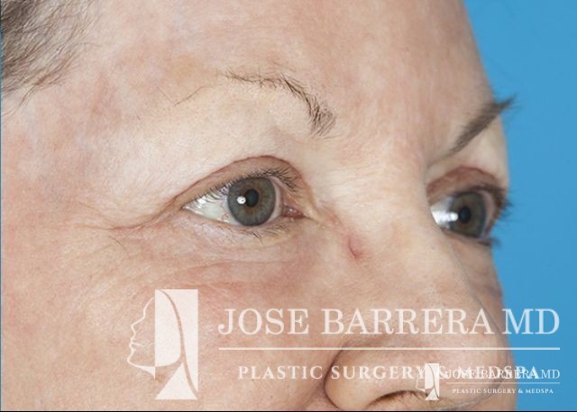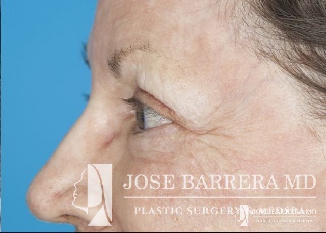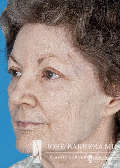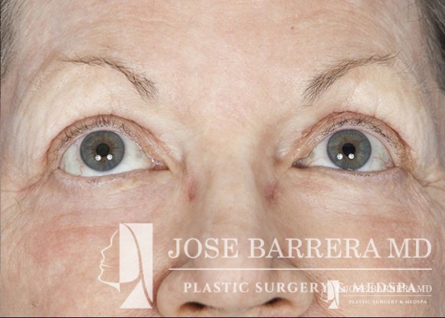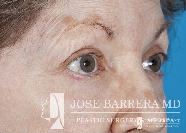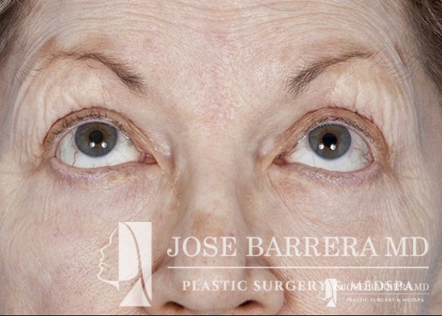 Patient with severe rhytids (wrinkles) and excessive droopiness of the eyelid skin. She underwent CO2 laser resurfacing and upper blepharoplasty to improve dermatochalasis, eyelid hooding, and severe wrinkles of the mouth, cheeks, eyelids, and forehead.