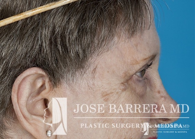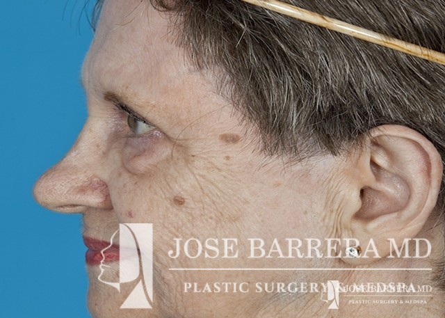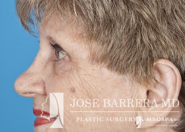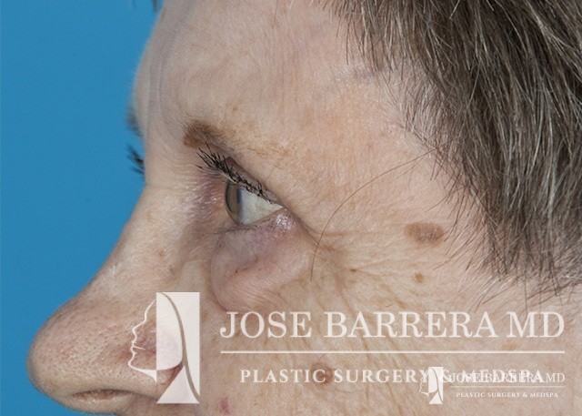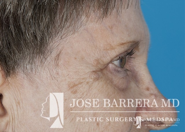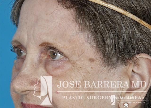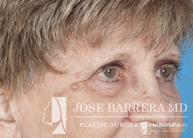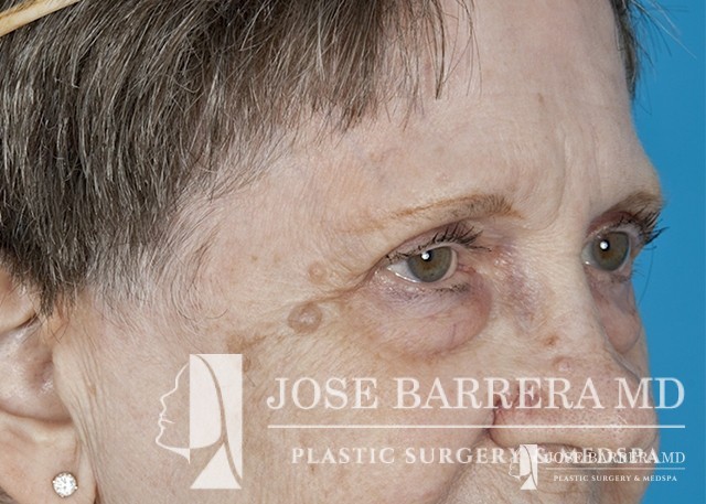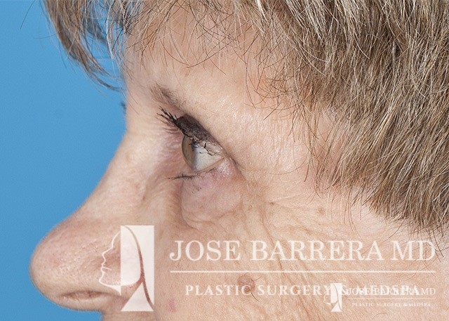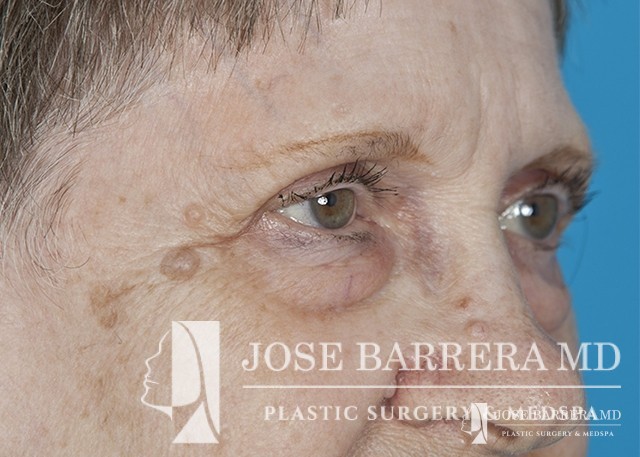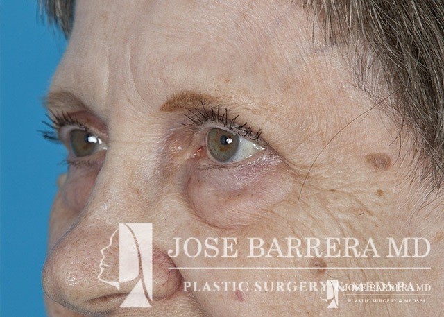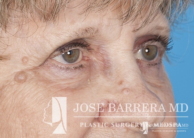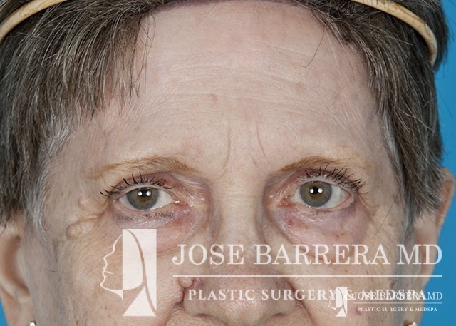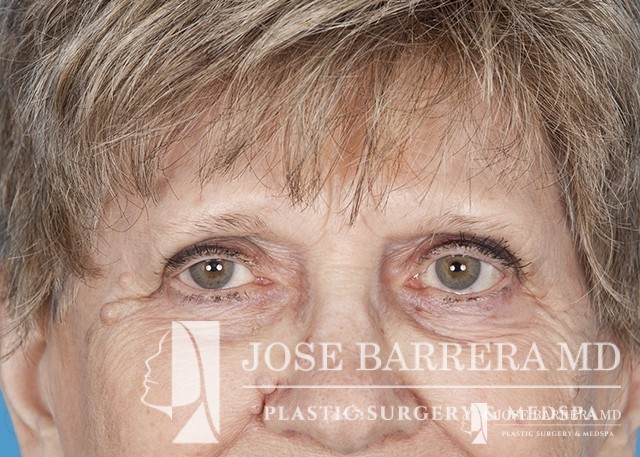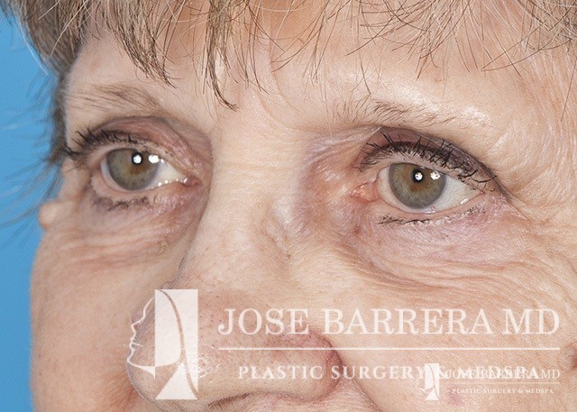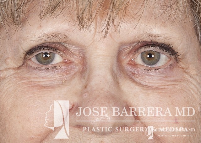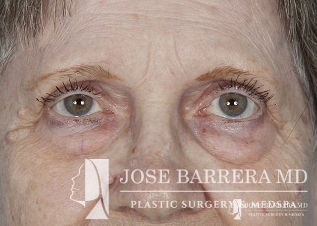 80 yo female who with extensive lower eyelid fat herniation and fullness. The patient underwent a lower eyelid blepharoplasty to remove the extensive fat pockets in her lower eyelid.