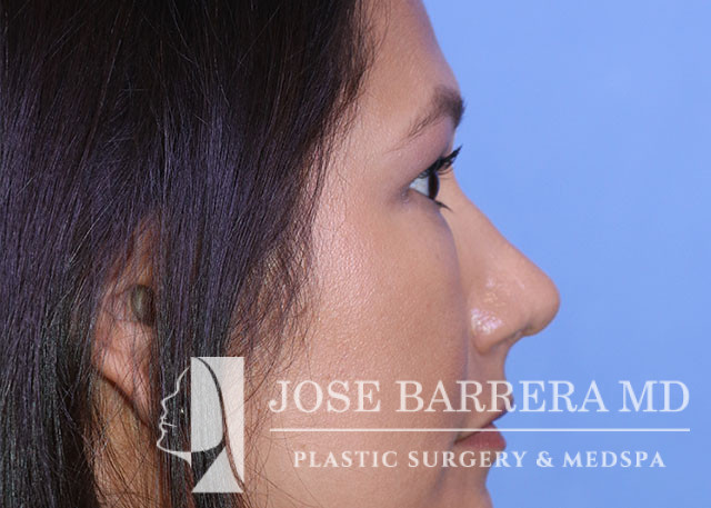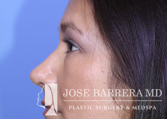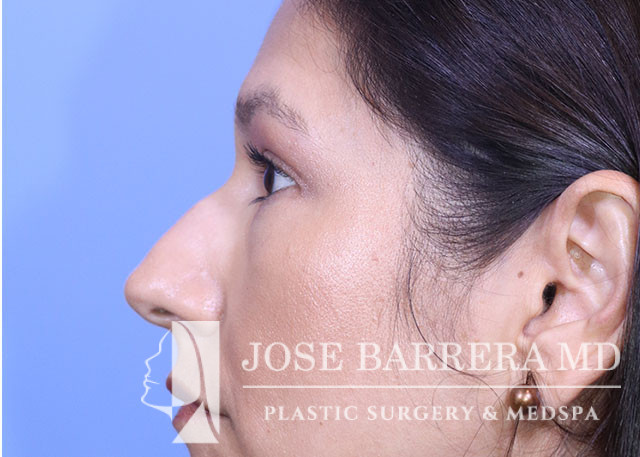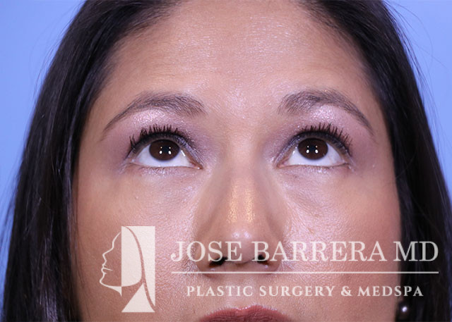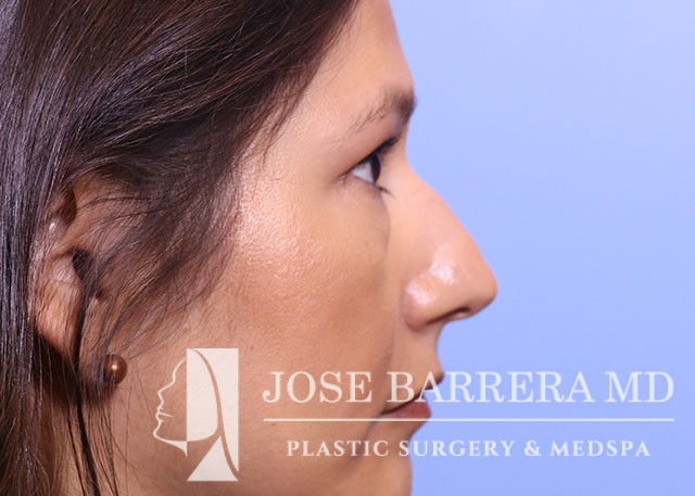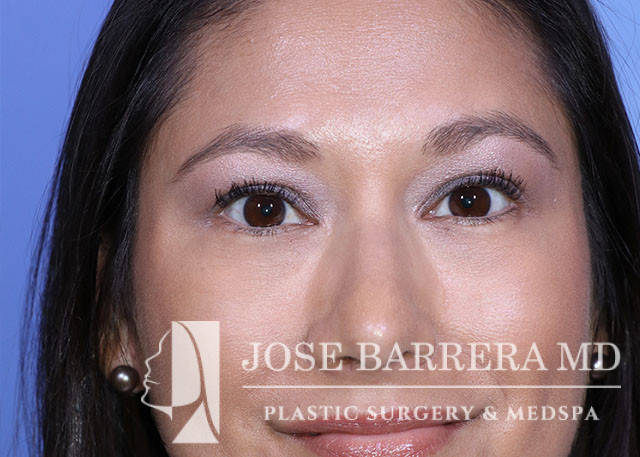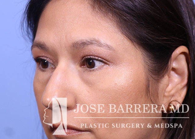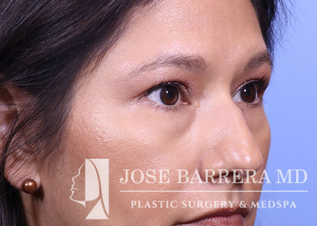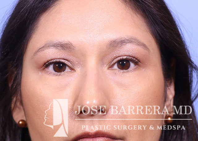 46-year-old female presenting with eyelid and aesthetic nasal concerns. Patient desires dorsal hump reduction, increased tip rotation for a ptotic nasal tip, and tip refinement. The patient also expresses concern regarding tired appearing eyes and deep tear trough region. The patient reports she underwent facial filler injection in 2018 which she feels left lower eyelid watery edema. The patient also notes she has struggled with dry eyes in the past. She underwent a Primary cosmetic preservation rhinoplasty with septal cartilage grafting (left SEG, left dorsal crushed cartilage graft); turbinoplasty, and lower blepharoplasty with fat transpositon (central and medial fat transposed, lateral fat pad reduced). She looks amazing!