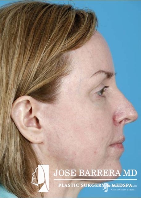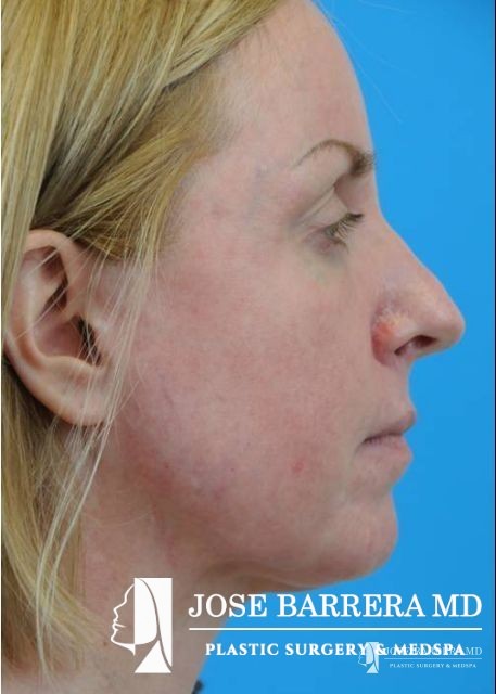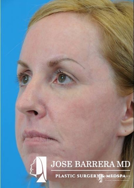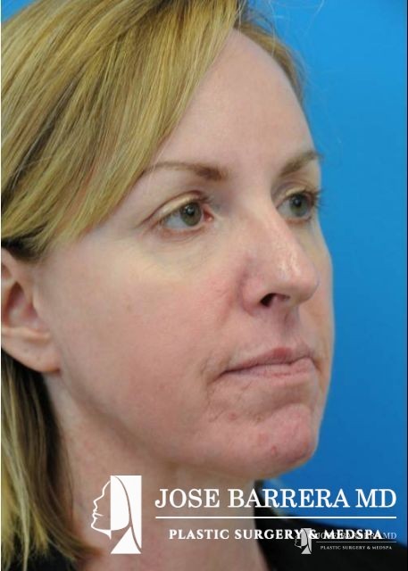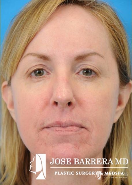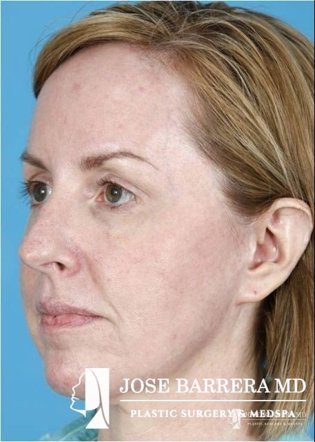 This patient underwent fractional CO2 laser resurfacing using the Lumenis Active and Deep FX laser. Juvederm Ultra Plus filler was used to improve the tear trough, melolabial folds, and peri-oral wrinkles. She also had an improvement in acne scarring.