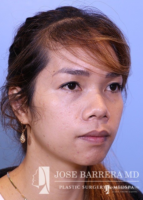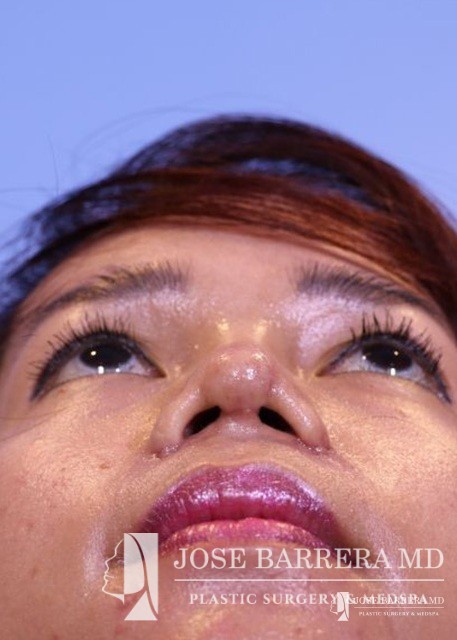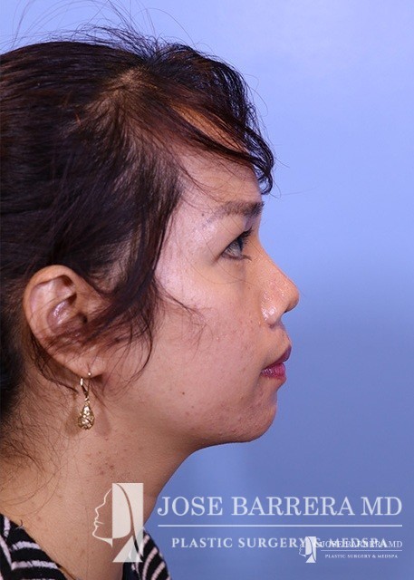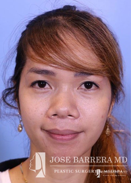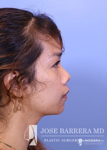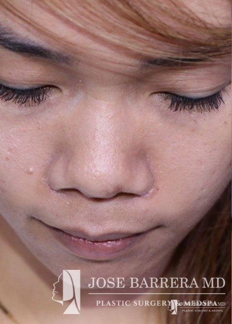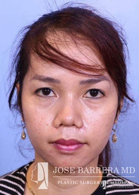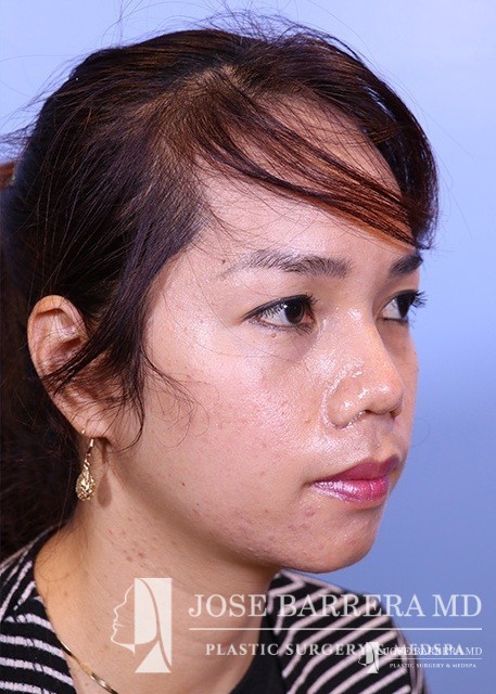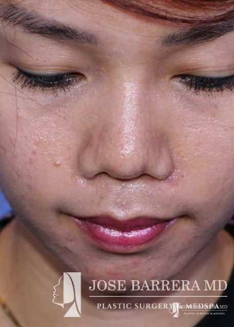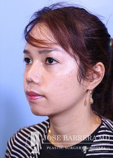 27-year-old female patient seeking Asian Rhinoplasty to improve the flatness of her nasal pyramid and to narrow her nasal tip Dr. Barrera performed dorsal augmentation using diced cartilage glue graft, rib graft, tip refinement, and Weir excisions to narrow the nasal base.