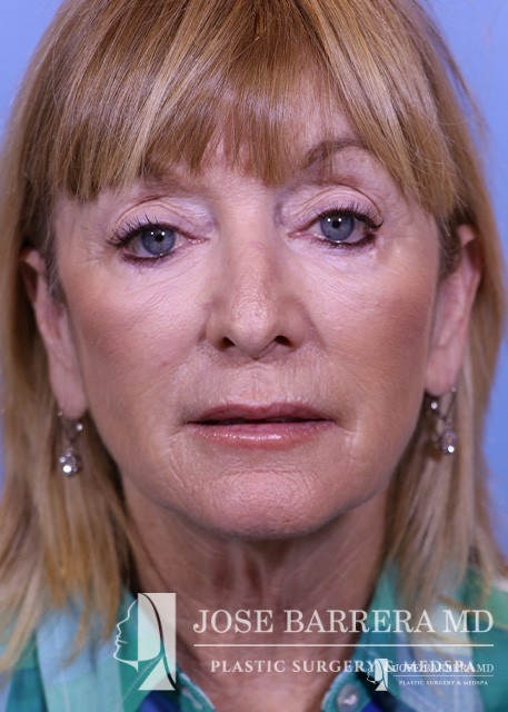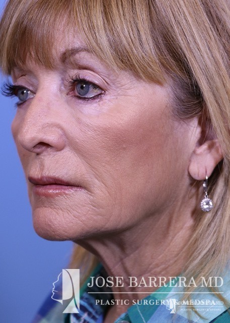 This patient is shown after deep plane facelift surgery and CO2 laser skin resurfacing. She is 6 months after surgery and is showing improvement in the neck laxity and jowls. CO2 laser resurfacing was performed for the face and eyelids at the same time as her deep plane facelift. In tear troughs, she is showing improvement to the deep wrinkles around her mouth and eyes, and increased volume in the cheek.