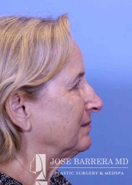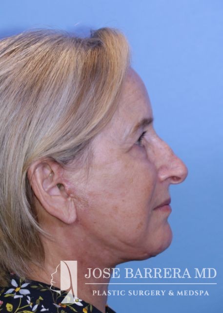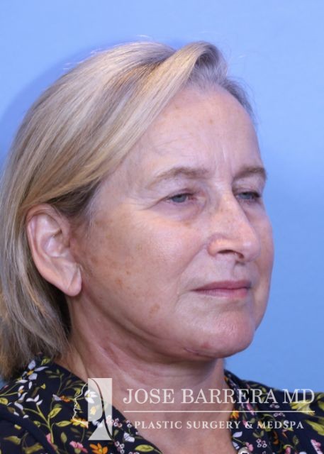 Our patient presented with persistent jowls and platysma neck banding. She underwent deep plane facelift and deep necklift with Dr. Barrera. The patient is 3 months postop from her surgery.