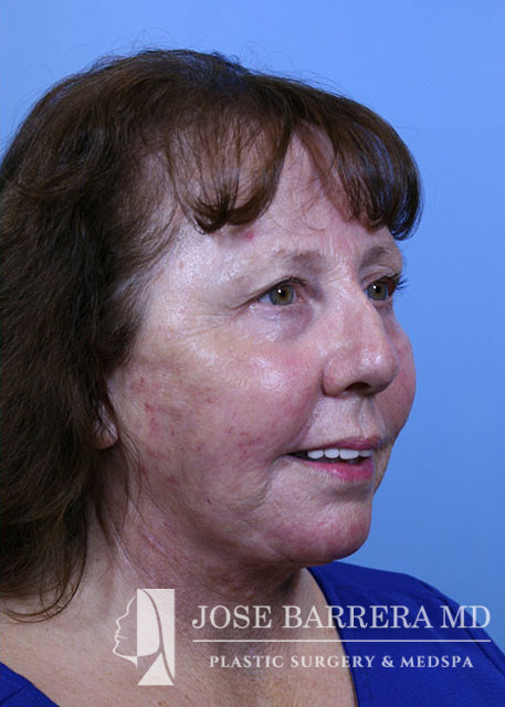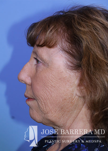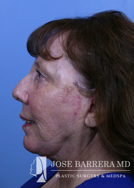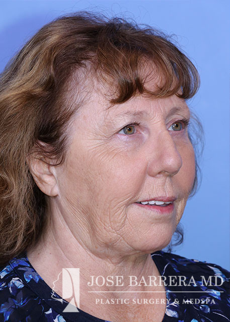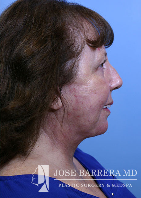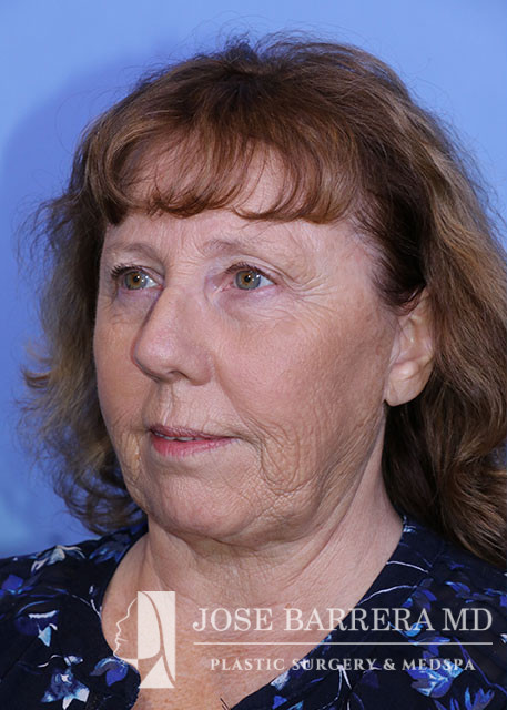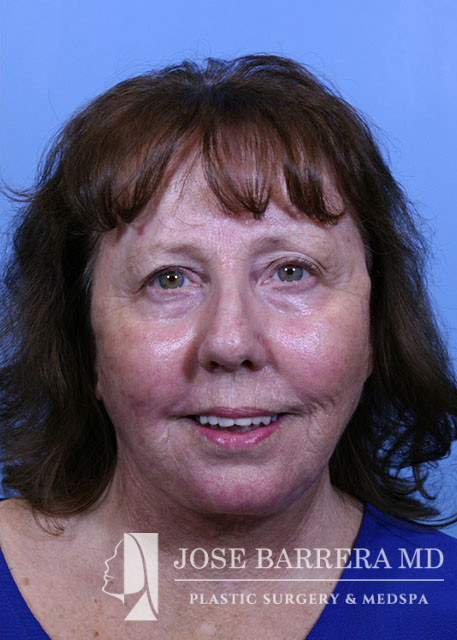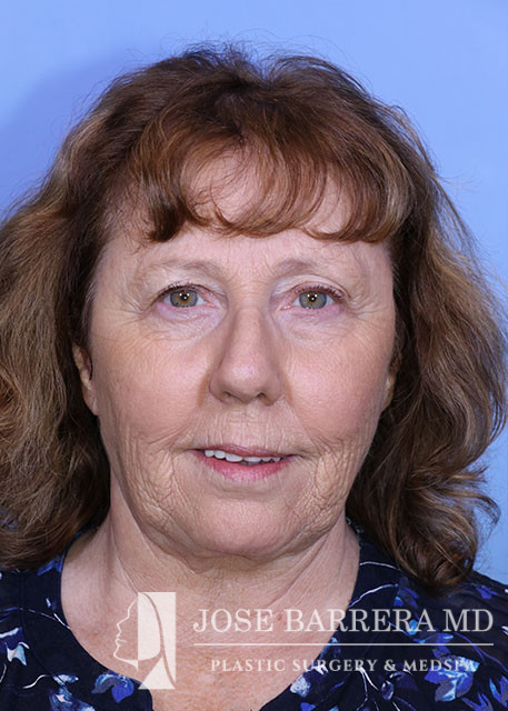 63-year-old female presenting today in consultation for cosmetic aging face concerns. Patient expresses concerns regarding forehead rhytids, crow’s feet, marionette lines, facial rhytids, brow ptosis, upper lid dermatochalasis, prominent tear troughs, jowling, neck laxity . She had a previous facelift neck lift 12 years ago. She had a Deep plane face and neck rhytidectomy and Full face CO2 laser resurfacing. She is 2 months postop and healing well.