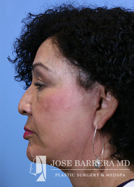 Next the right facelift incision was made. A subcutaneous flap was elevated, superficial to the great auricular nerve which was identified and preserved. The flap was connected to the plane developed in the neck. The subcutaneous flap was then elevated medially up to a line drawn from the lateral canthus to the angle of the mandible. At this point, the deep plane was entered. The SMAS was sharply incised and a subSMAS plane was developed. The zygomaticus major muscle was identified and care was taken to only dissect superficial to the muscle to protect branches of the facial nerve. The SMAS flap was further elevated medially and inferiorly to include the platysma. The flap was incised horizontally, parallel to the body of the mandible to allow for more mobility. Fat over the sternocleidomastoid was then excised to reduce bulk. The inferior portion of the SMAS flap was advanced posteriorly and secured to the mastoid periosteum with 3-0 PDS. Cervicocutaneous retaining ligament was also released and then secured posteriorly with 3-0 PDS. This created a well defined jawline. Fat was advanced along with this flap to allow for gonion augmentation. The superior portion of the flap was advanced superiorly and secured to the pre-auricular SMAS and fascia with 3-0 PDS. The area was inspected for any bleeding and careful hemostasis obtained. Excess skin was then carefully trimmed to ensure there was no tension on the final closure. The tragal skin was thinned. The same procedure was performed on the left face.
