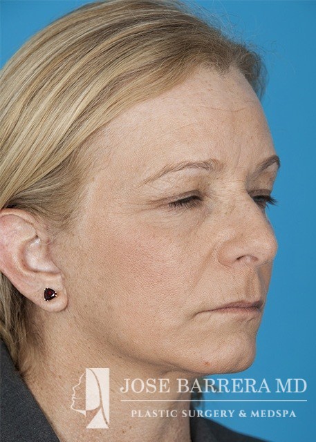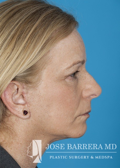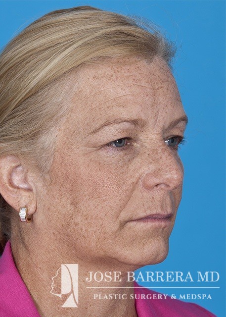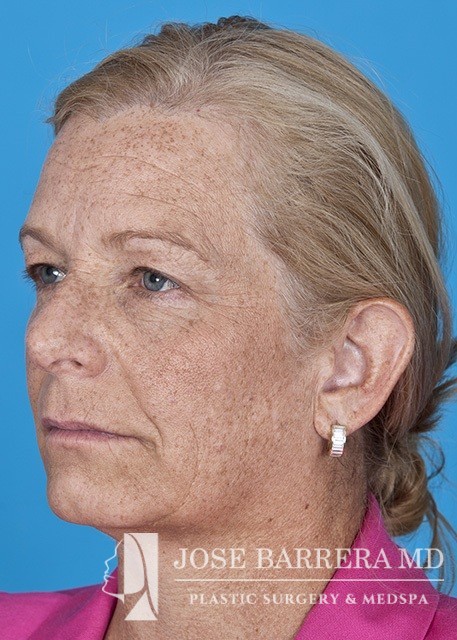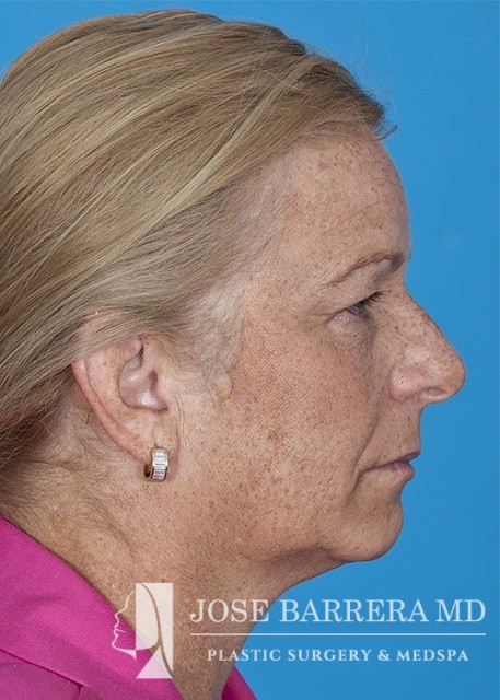 This patient underwent SMAS facelift and CO2 laser skin resurfacing with the Lumenis Active and Deep FX laser. She presented with significant platysma banding, midface volume loss, hyperpigmentation, jowling, and solar elastosis which is improved after surgery.