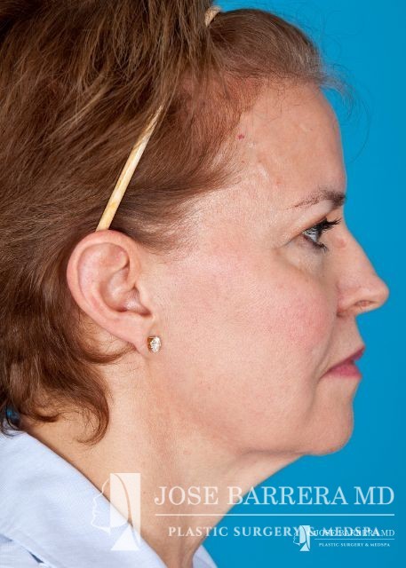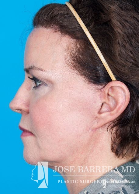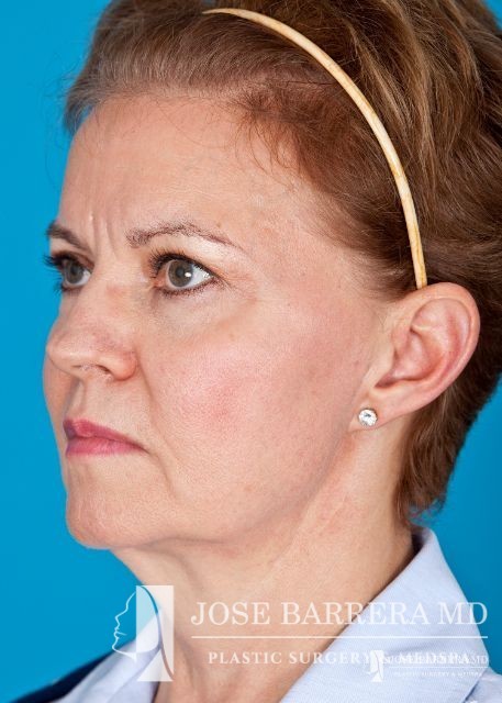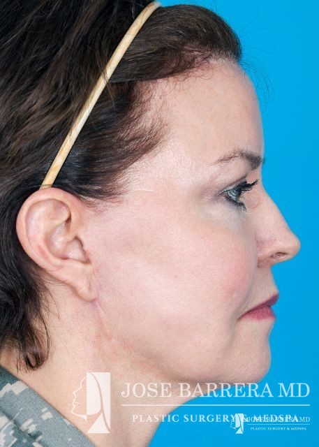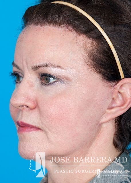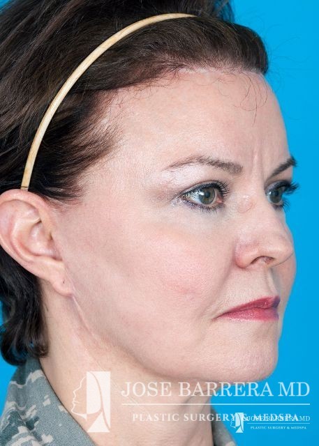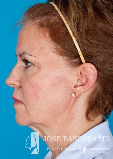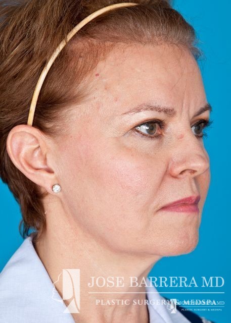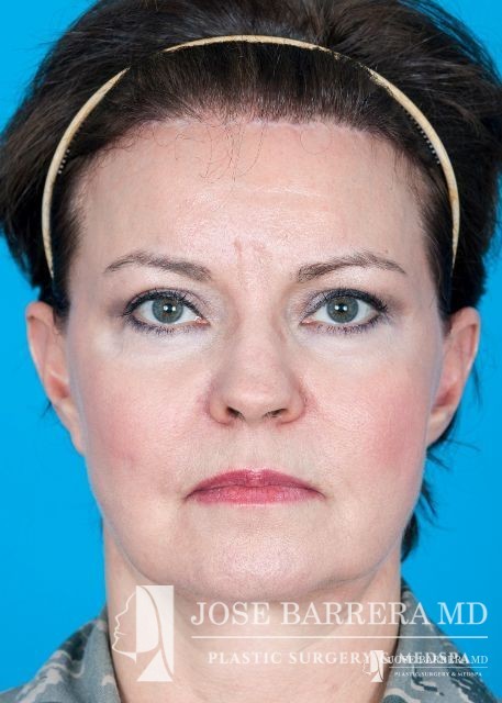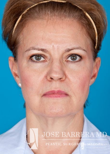 A 50 year old woman treated with facial fat grafting, SMAS facelift CO2 laser resirfacing, and endobrow lift. 1 year post op.