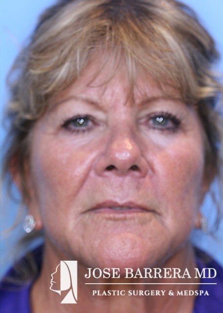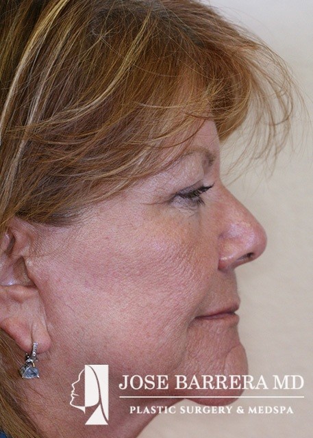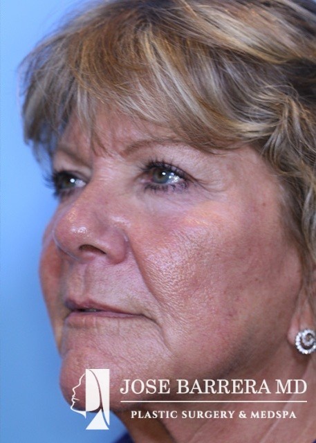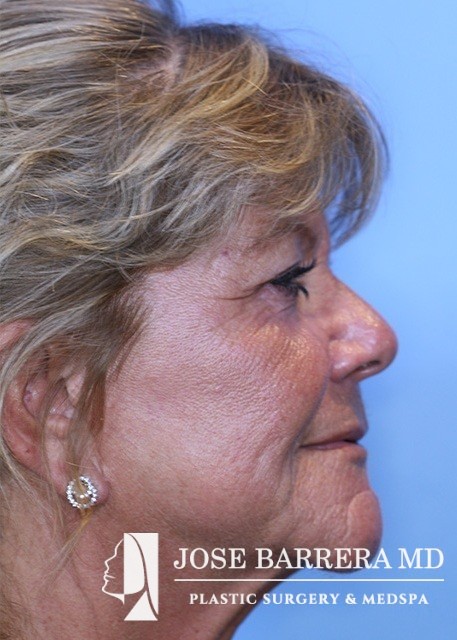 This 64-year-old female patient underwent tear trough fillers and cheek implant for traumatic reconstruction of her right cheek.