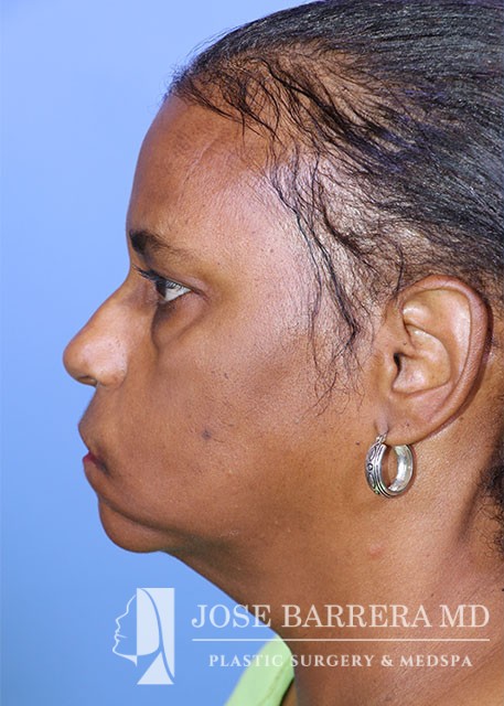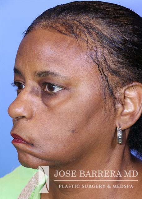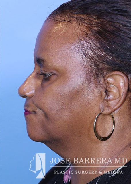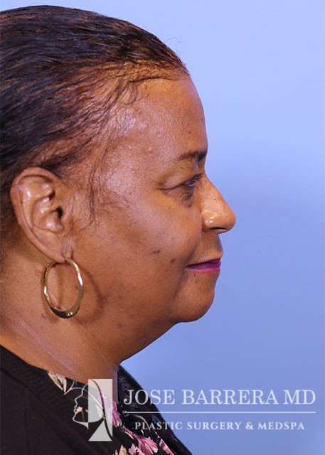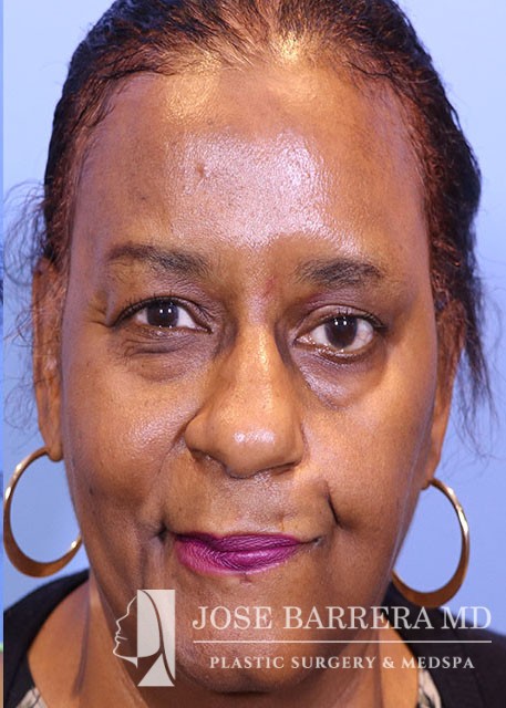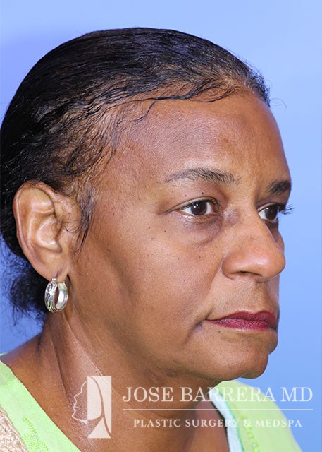 63-year-old female with a 20 year history of an acoustic neuroma. She unfortunately experienced long-term left side complete facial paralysis. Dr. Barrera performed Temporalis Tendon Transfer for Facial Reanimation with a Tensor Fascia Lata graft. To improve her eyelid paralysis performed a left eyelid gold weight. She is now 12 months postoperative from surgery.