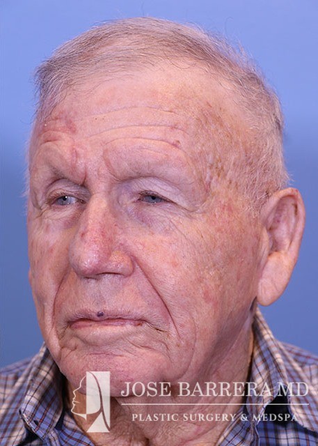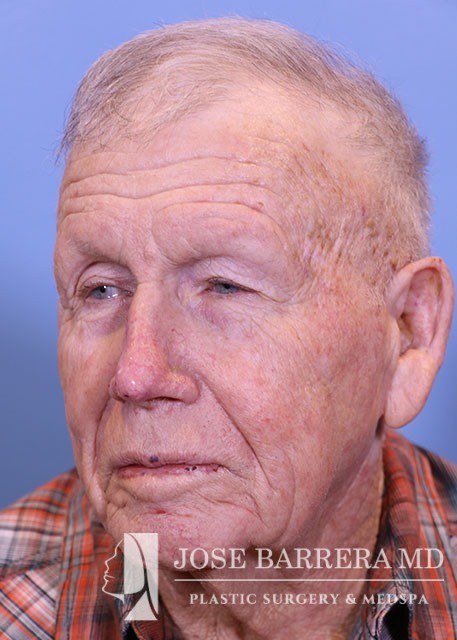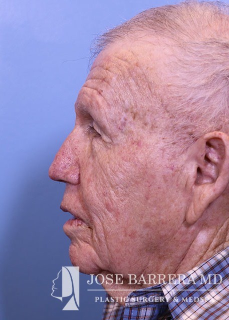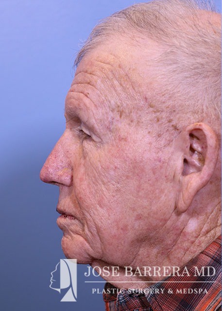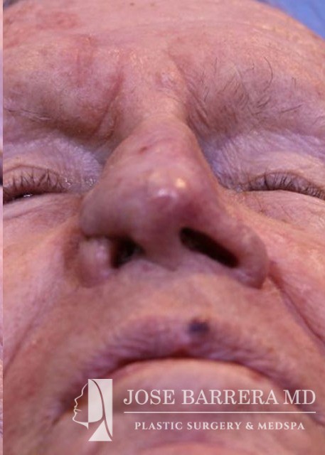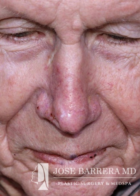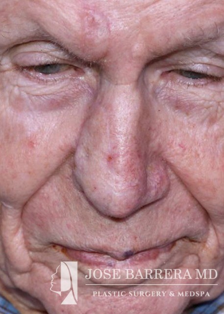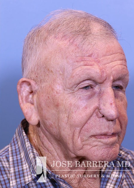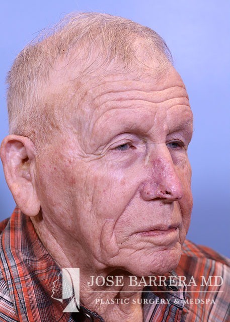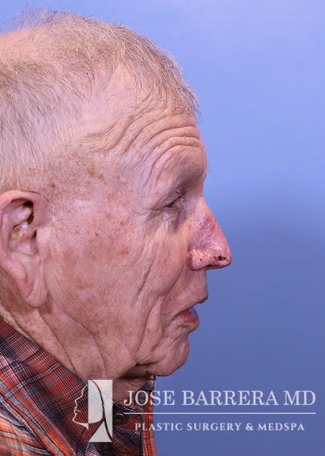 84-year-old male who was diagnosed with basal cell carcinoma of the nose. He had a composite through and through resection of his right ala, sidewall and nasal tip. He underwent nasal reconstruction with a paramedian forehead flap for skin coverage, ear cartilage graft for alar rim reconstruction, costal cartilage graft for midvault reconstruction and internal lining septal hinge flaps for inner lining. He is 4 months postop from surgery.