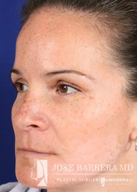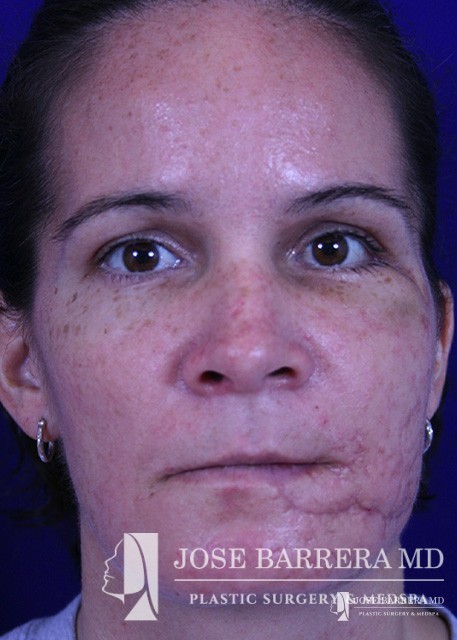 This 37 year old police officer was on-duty was she was struck at a high rate of speed on her driver-side. She underwent a three-stage reconstruction. The first stage was Lefort I open reduction internal fixation, ORIF mandible, and orbital fracture repair. Stage 2 was a left eyelid and canthal tendon repair. Stage 3 was Erbium: Yag Laser resurfacing and cheek scar revision.