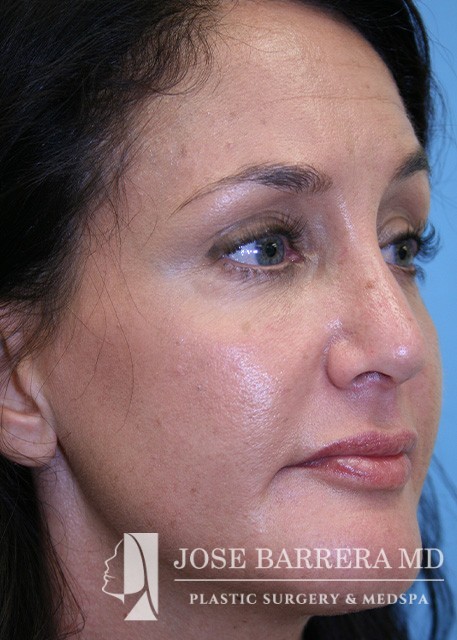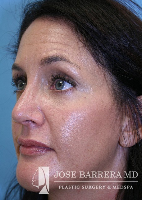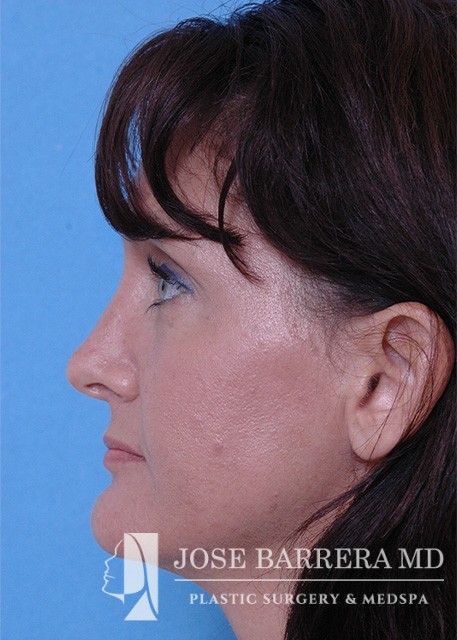 The patient had a rhinoplasty to improve nasal projection. Spreader grafts and onlay cartilage graft was used to improve the profile. In addition, the patient underwent a sliding genioplasty setback to improve the overly projecting chin. The chin was reduced to improve the facial profile. To improve skin texture and acne scarring, a CO2 laser was used to resurface the skin.