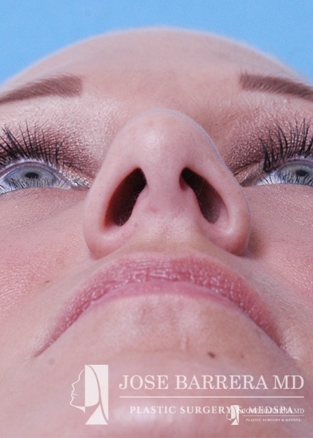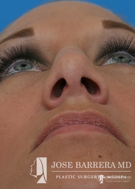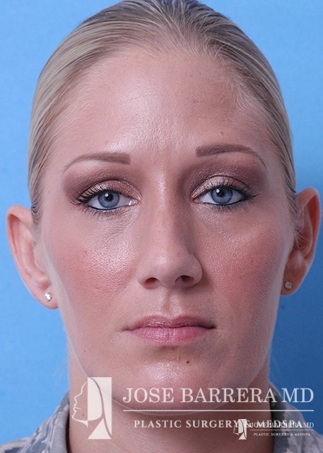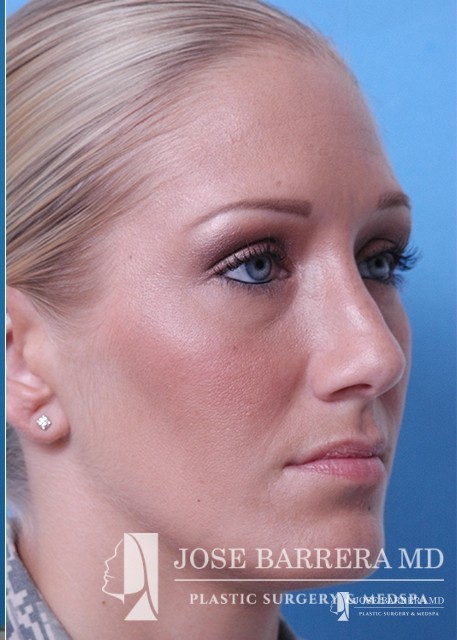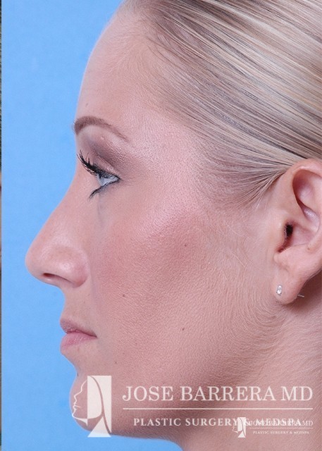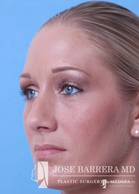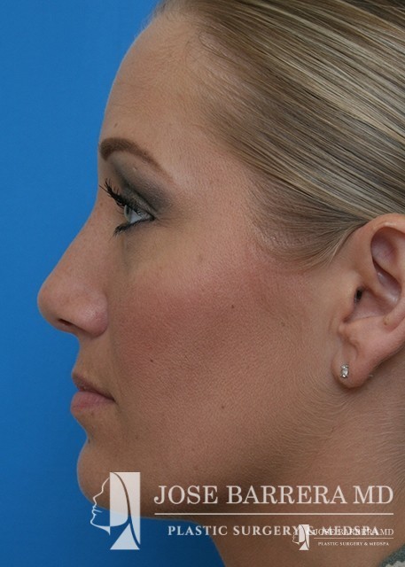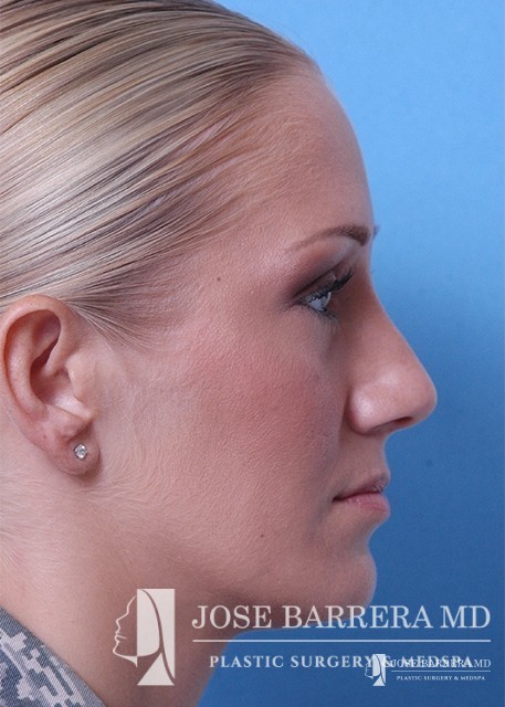 Patient desiring hump reduction and improvement in the twisted nasal tip. A septorhinoplasty was performed to straighten the nasal tip and give the patient a gentle slope to her nose.