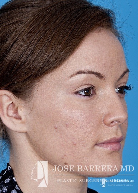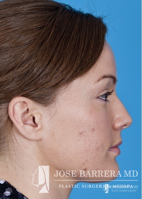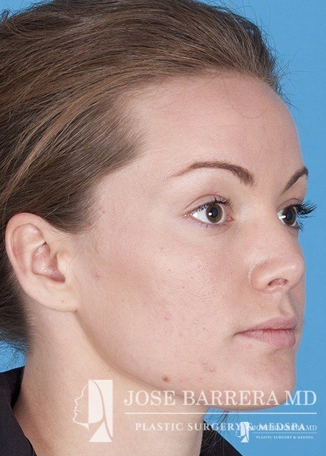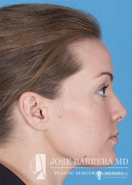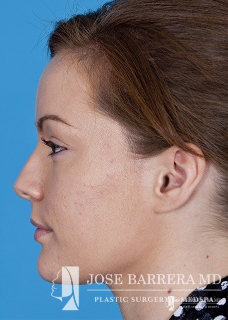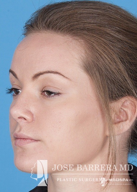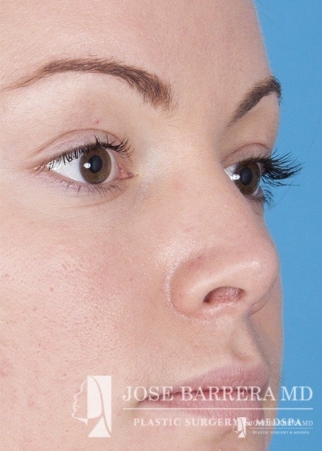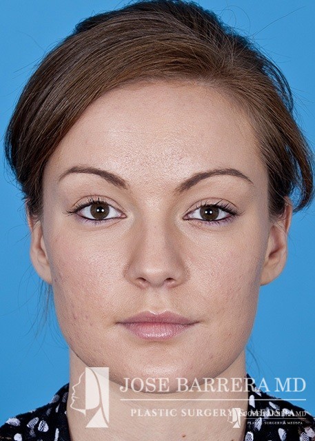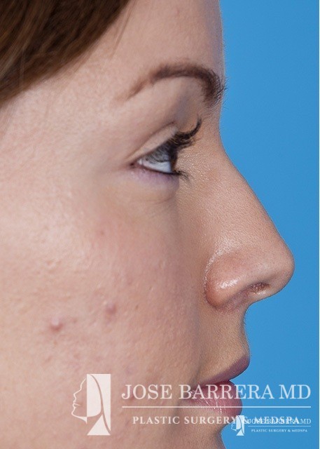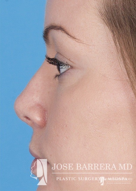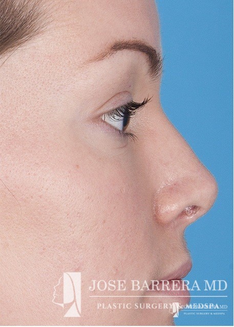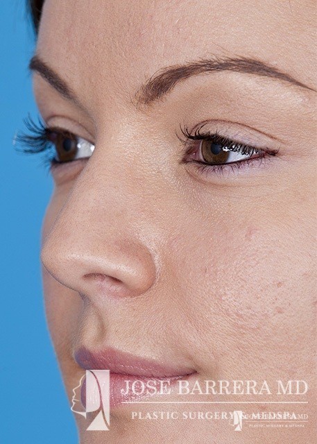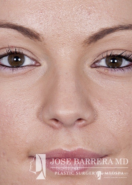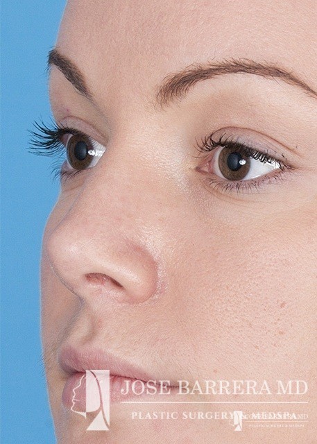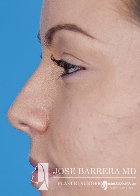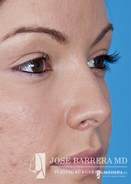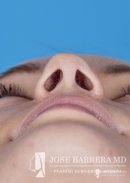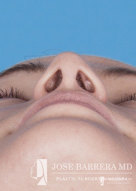 Our patient is 6 months after rhinoplasty. A small hump was removed and the boxy nasal tip was refined. The base view shows improvement in the boxy tip and symmetry of the alar base.