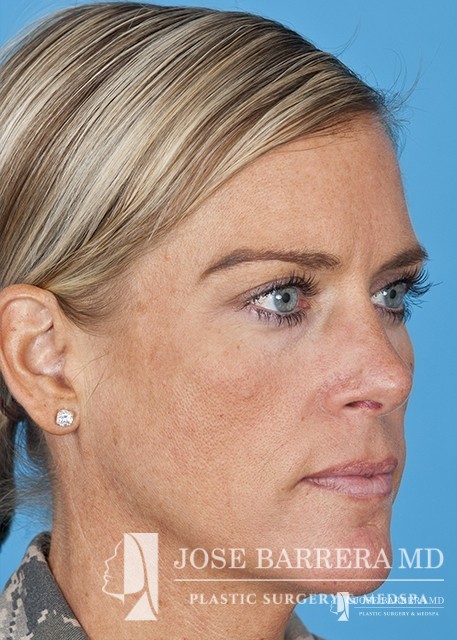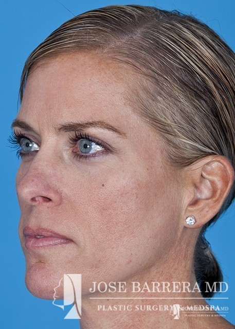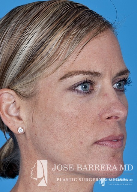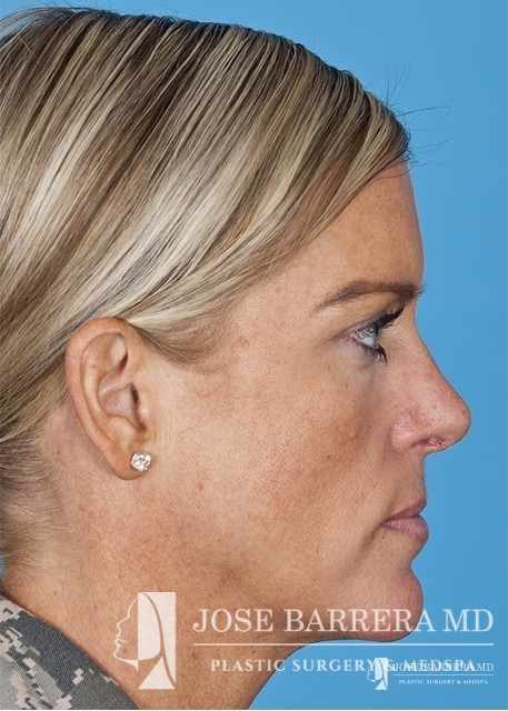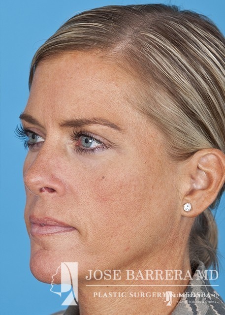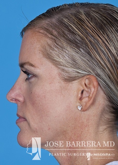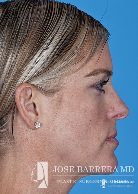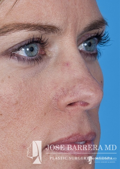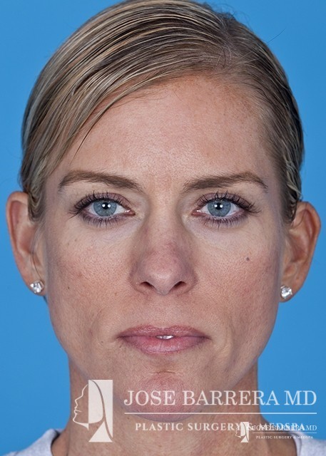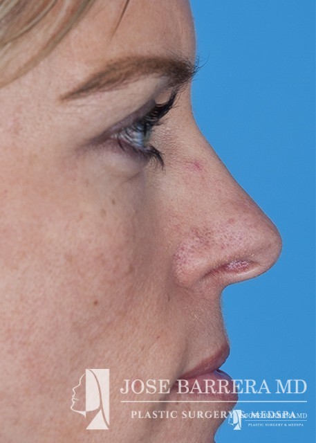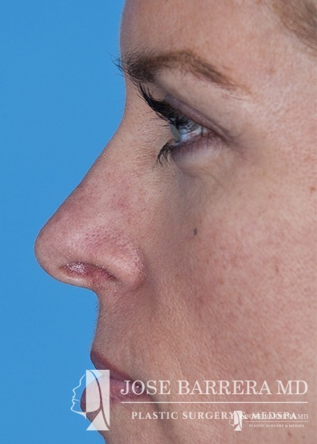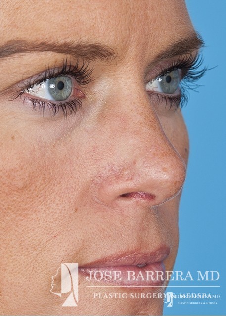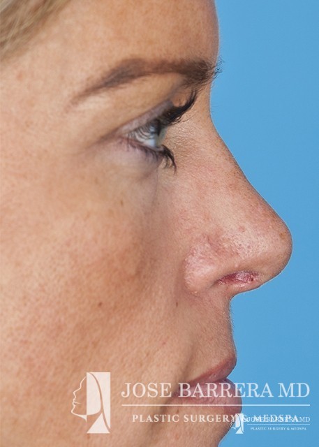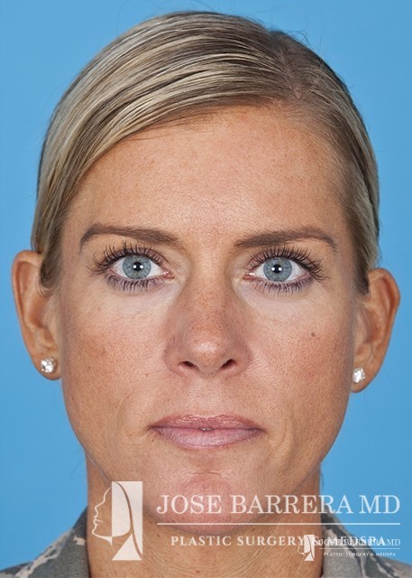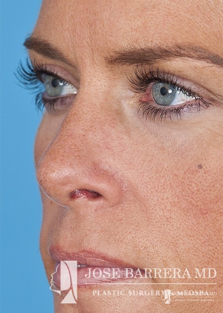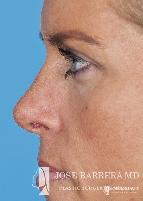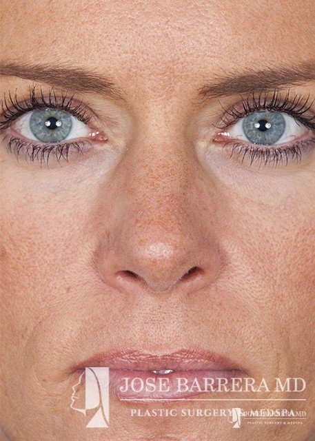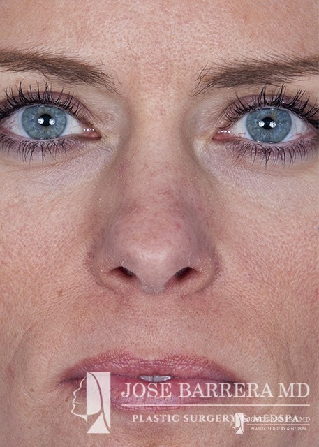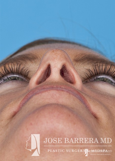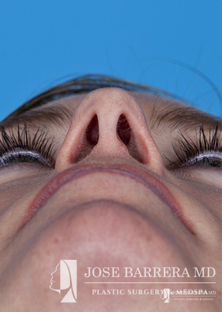 The patient underwent a functional and cosmetic rhinoplasty. A septoplasty surgery was performed. The nose was also deprojected and the boxy tip was refined as part of the cosmetic portion of the surgery. The base view shows a smaller and more triangular aesthetic nasal tip.