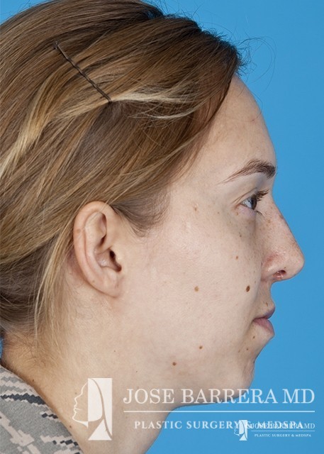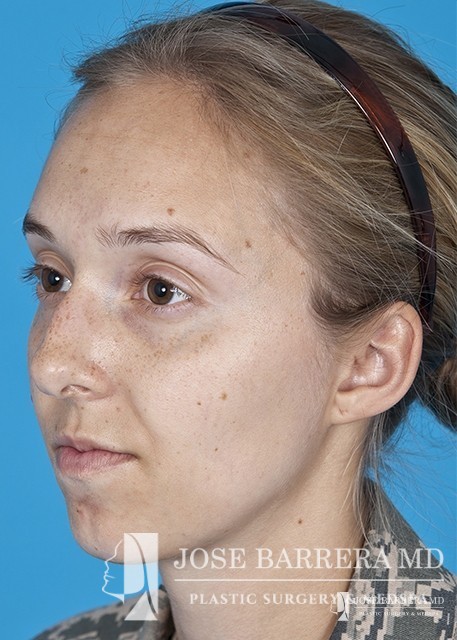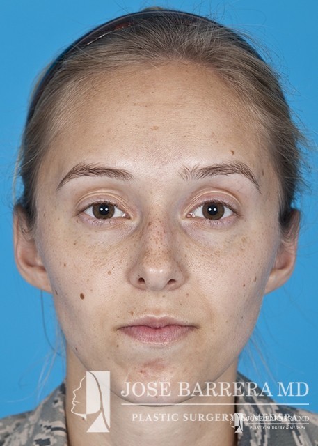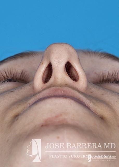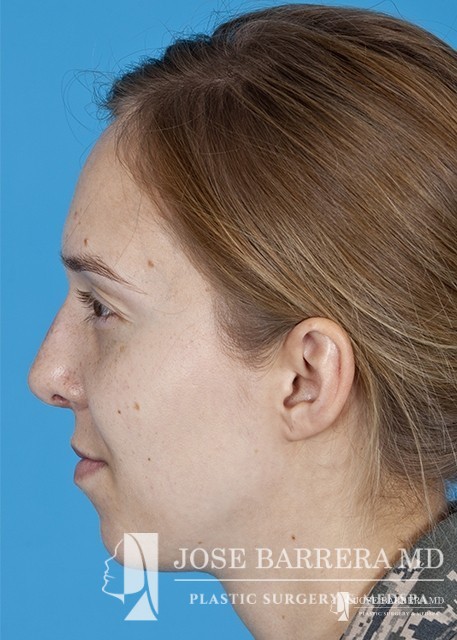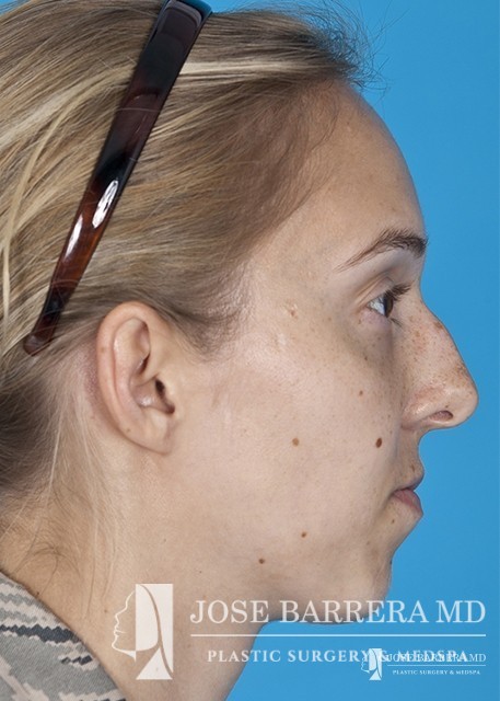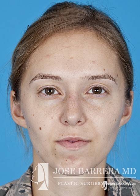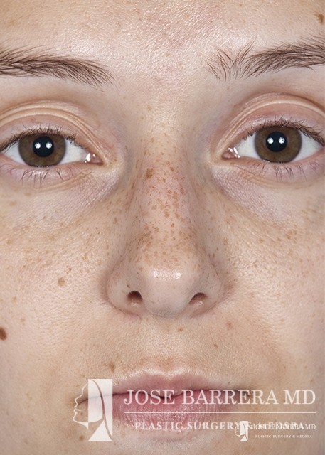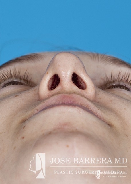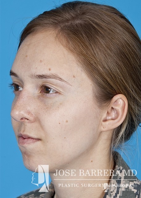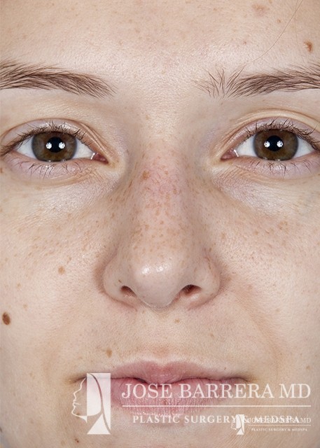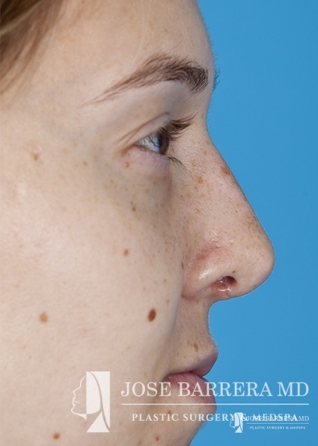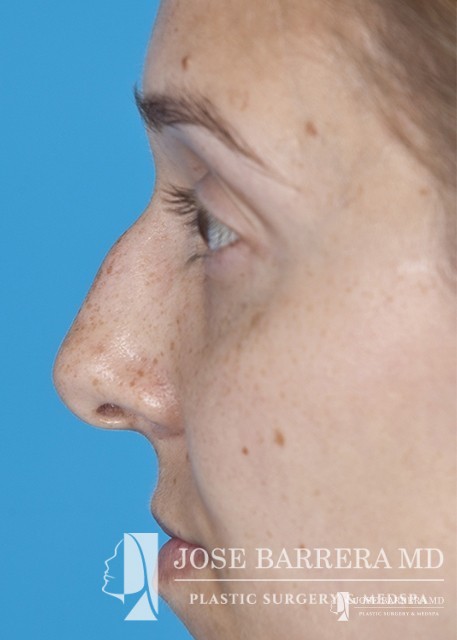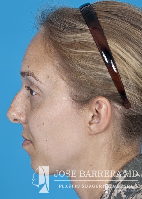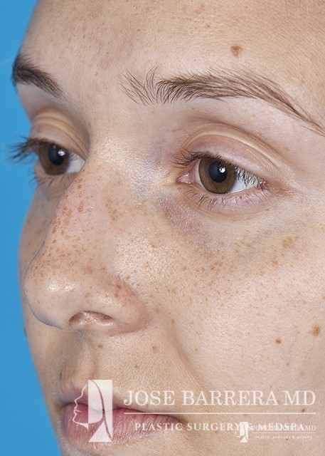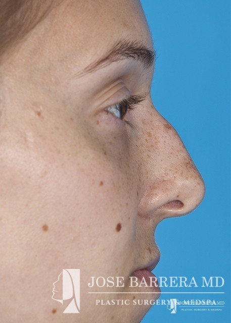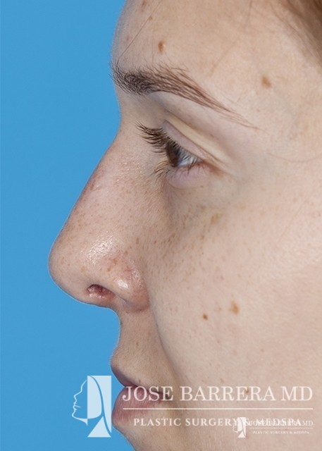 The patient is 3 months after rhinoplasty surgery to remove a dorsal hump and improve a boxy nasal tip. Cephalic resection of the alar cartilages was performed to improve the boxy tip. The crooked nose was improved using spreader grafts.