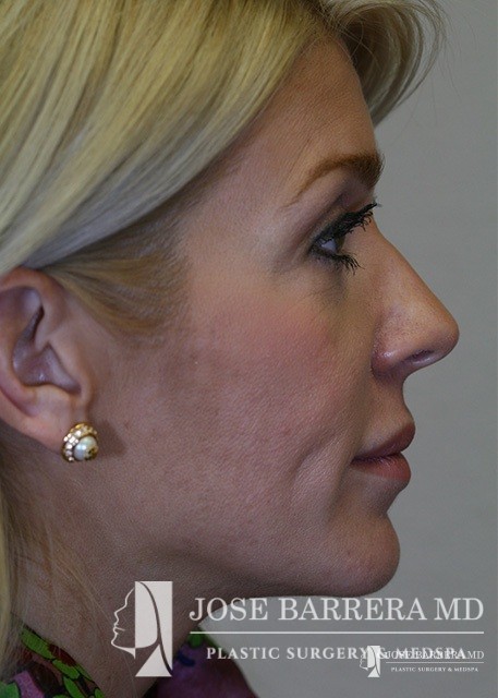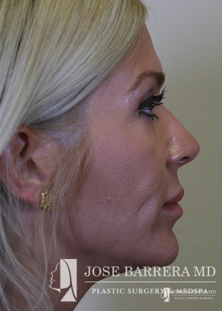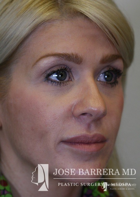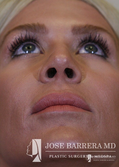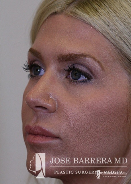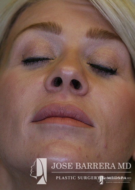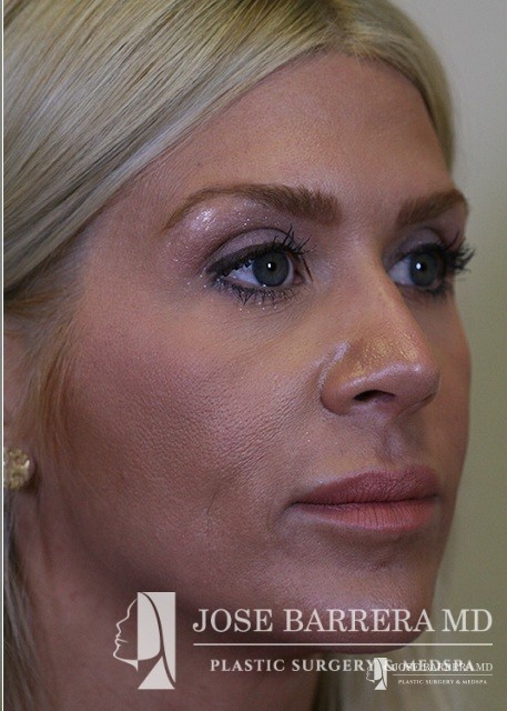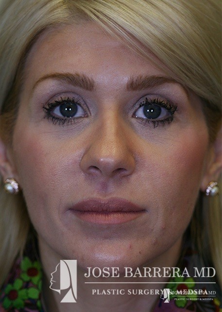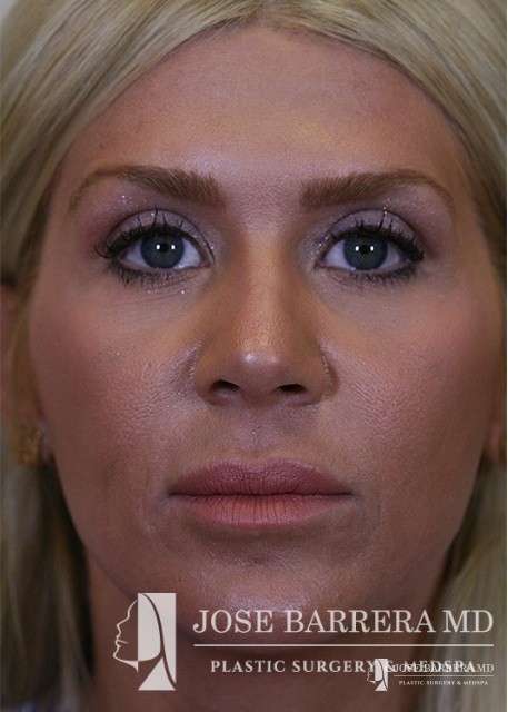 The patient is 7 months postoperative after rhinoplasty to improve the nasal tip. The boxy nasal tip was refined using cephalic resection of the alar cartilage followed by precise dome spanning sutures. Asymmetry of the nose was corrected using spreader grafts through an open rhinoplasty approach.