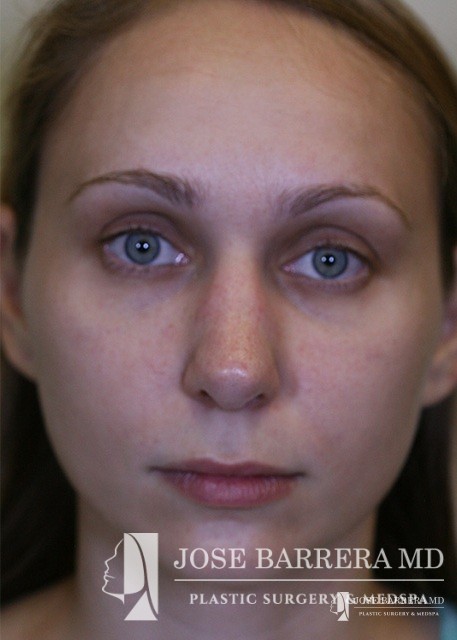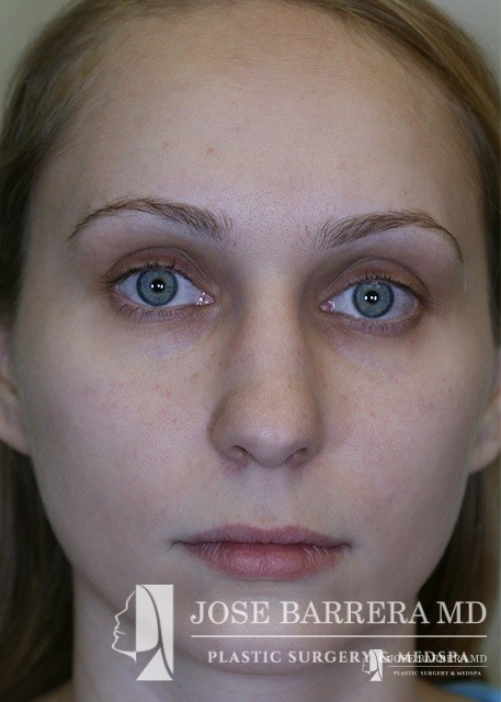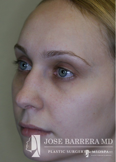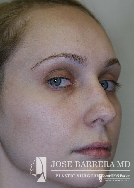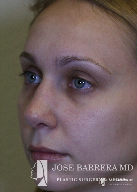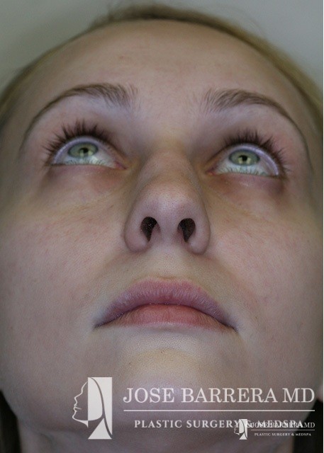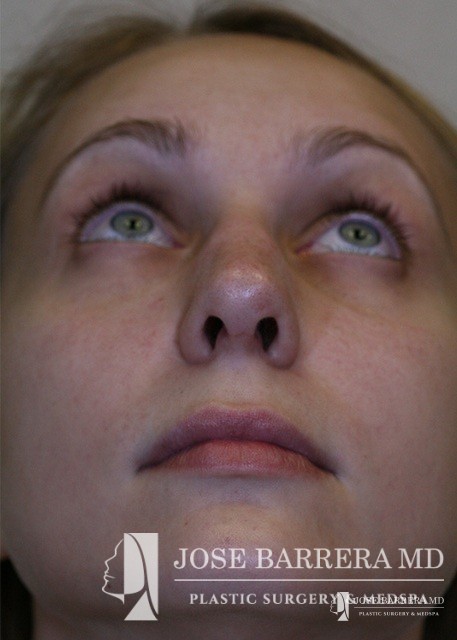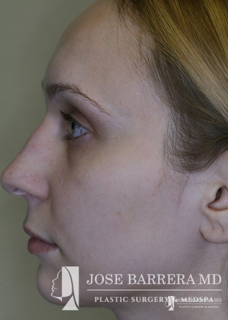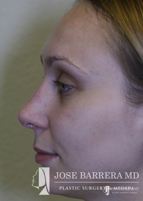 The patient is 5 months after cosmetic rhinoplasty to improve her nasal profile giving her a gentle slope on her dorsum of the nose and refine the nasal tip. Improved columella proportion was achieved.