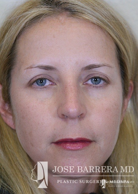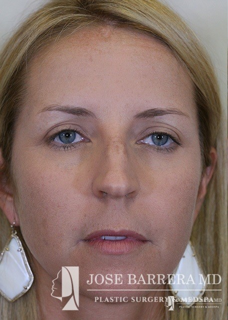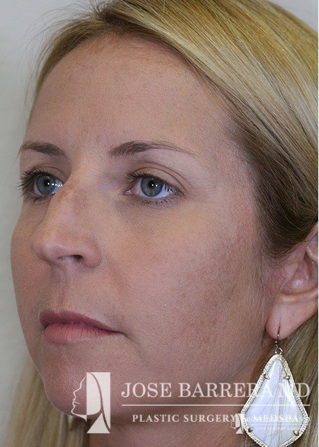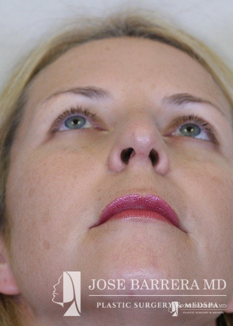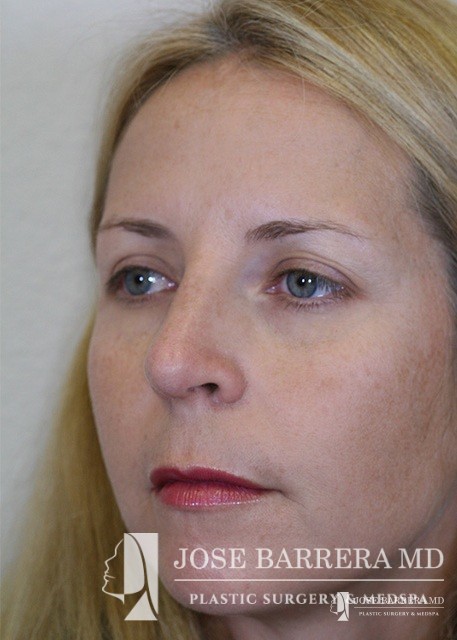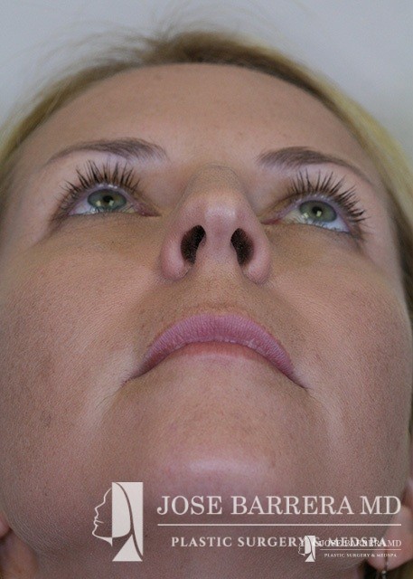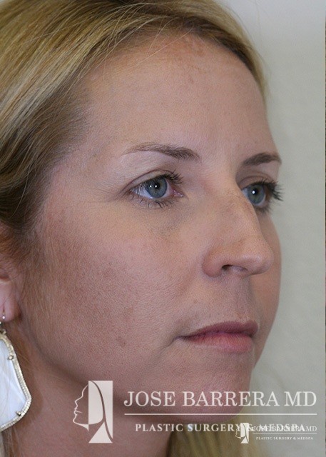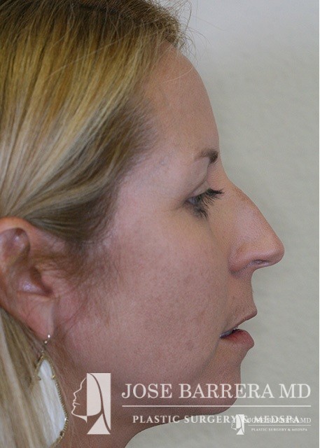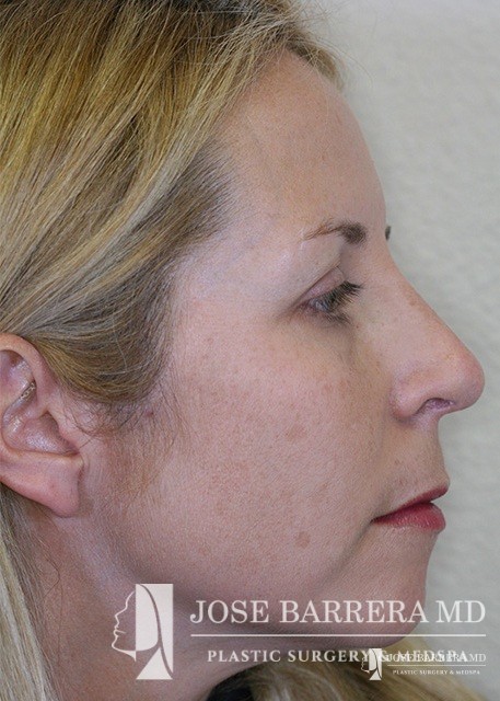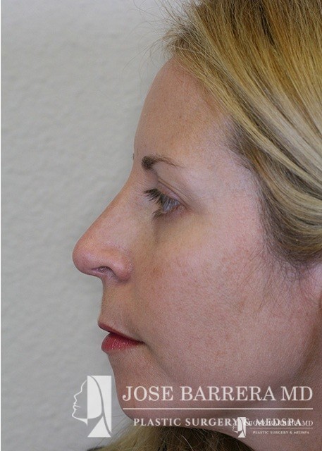 The patient is 5 months after septorhinoplasty. The rhinoplasty was performed to improve large rhinion spurs along her nasal bridge, depressions along her mid-vault, and down sloping nasal tip. A large hump was also removed and reconstructed with spreader grafts.