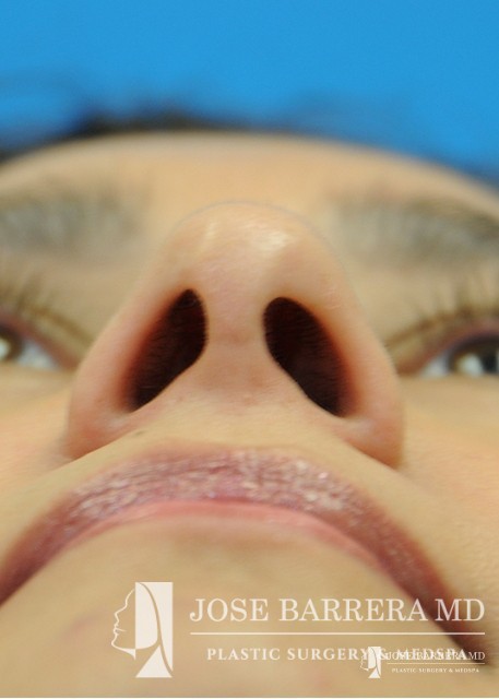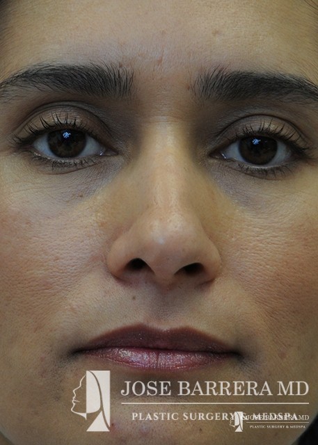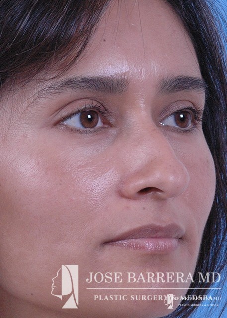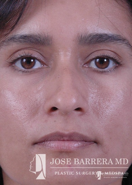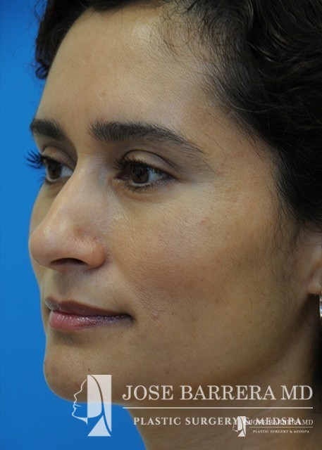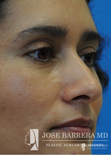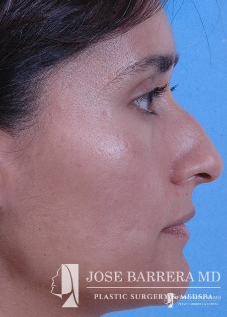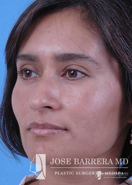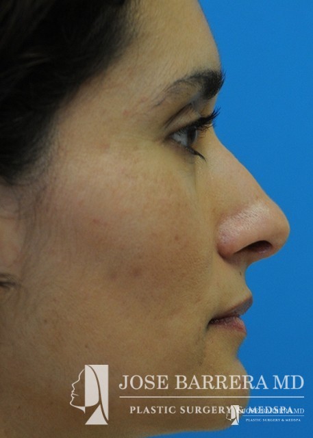 Patient with Mestizo nose with dorsal hump. She desired a more aesthetic and straighter nose while keeping her ethnic features present. A septorhinoplasty was performed to achieve these goals.