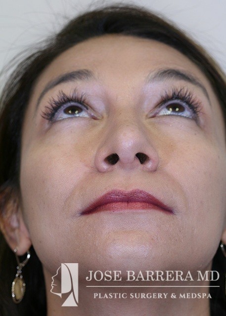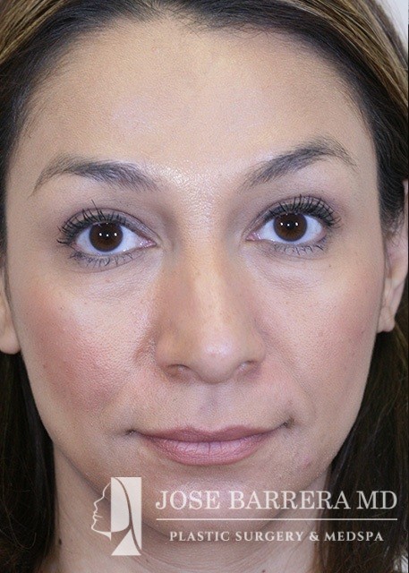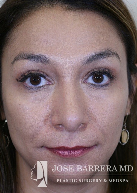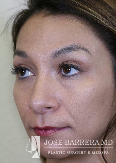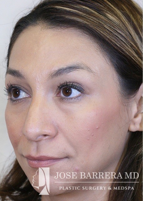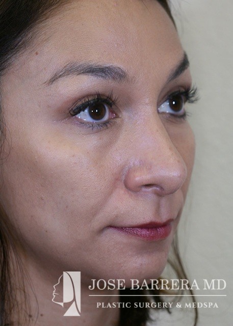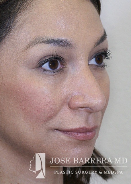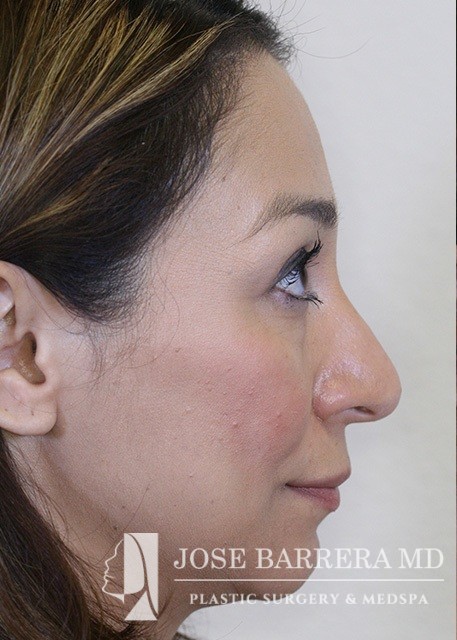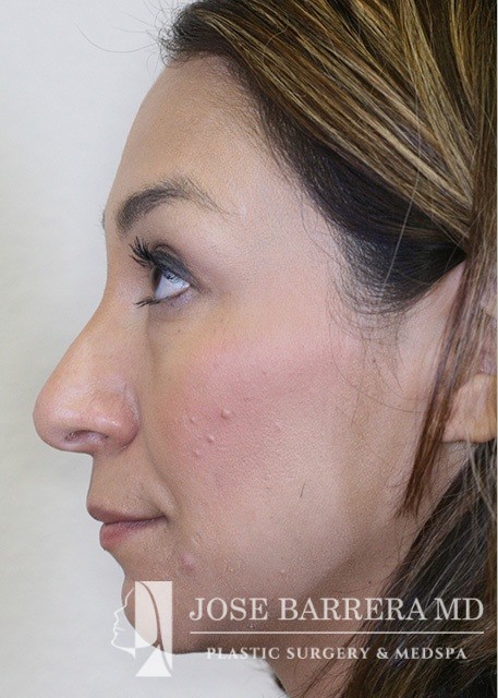 Patient presents with a dorsal hump and nasal tip droop. Dr. Barrera performed a septorhinoplasty. She is one-month postop.
