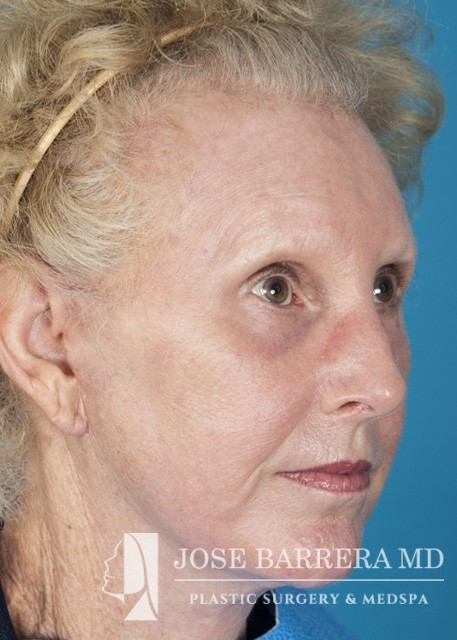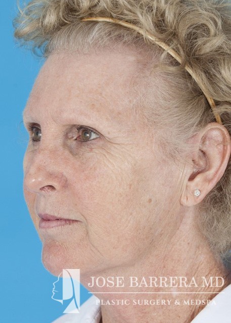 This patient presents with severe solar elastosis, hyperpigmentation, and fine wrinkles. She underwent CO2 laser resurfacing using Lumenis fractional active and deep FX. She is 3 months postop.