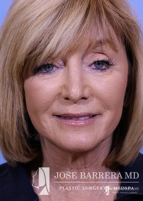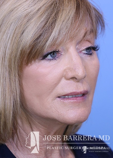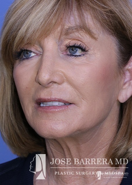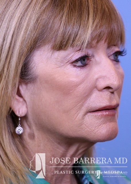 This patient is shown after deep plane facelift surgery and CO laser skin resurfacing. She is 6 months after surgery and is showing improvement in the neck laxity and jowls. CO2 laser resurfacing was performed for the face and eyelids at the same time as her deep plane facelift. In tear troughs, she is showing improvement to the deep wrinkles around her mouth and eyes, and increased volume in the cheek.