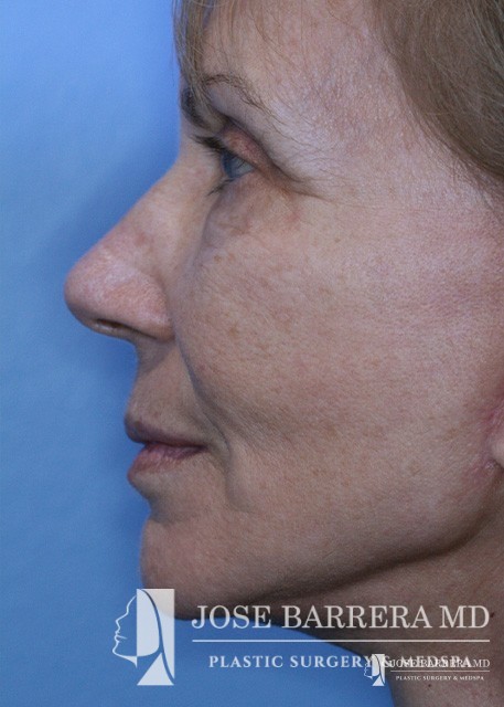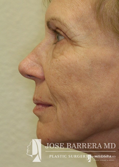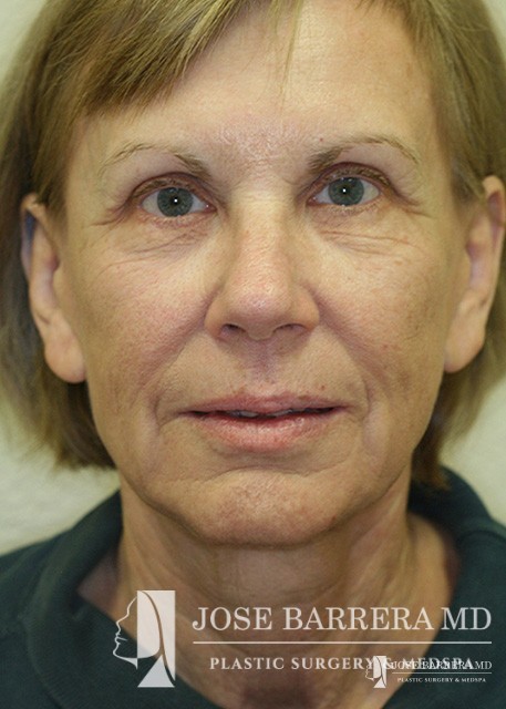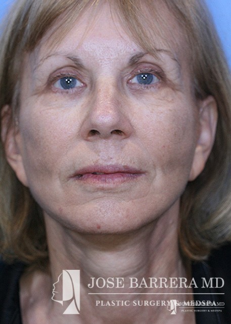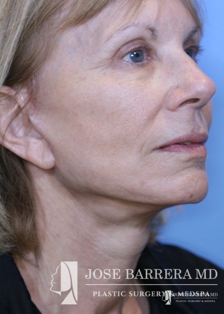 This patient underwent deep plane facelift surgery and CO2 laser skin resurfacing. She is 6 months after surgery and is showing improvement in the neck laxity and jowls is seen. CO2 laser resurfacing was performed at the same time as her deep plane facelift and she is showing improvement in tear troughs, deep wrinkles around her mouth and eyes, and increased volume in the cheek.