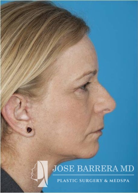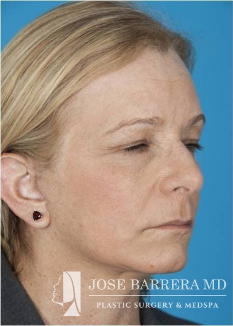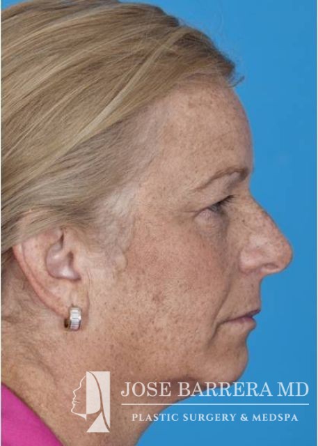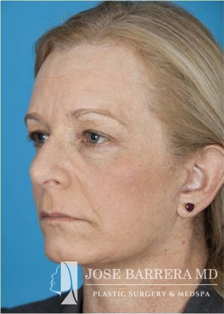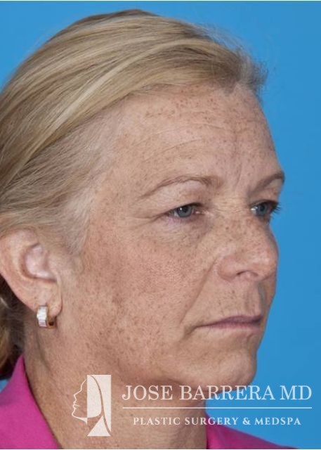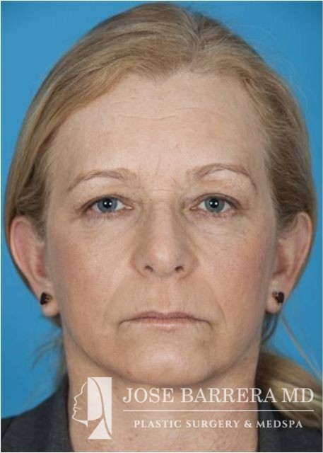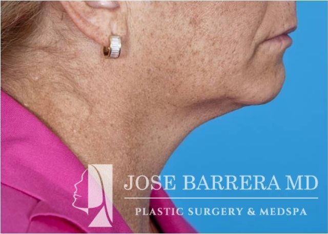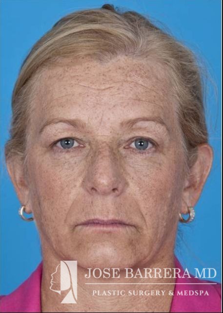 This patient underwent SMAS facelift and CO2 laser skin resurfacing with the Lumenis Active and Deep FX laser. She presented with significant platysma banding, midface volume loss, hyperpigmentation, jowling, and solar elastosis which is improved after surgery.