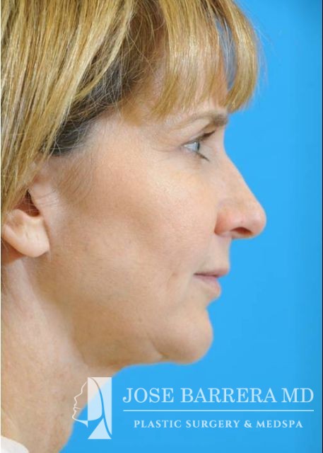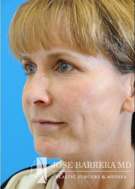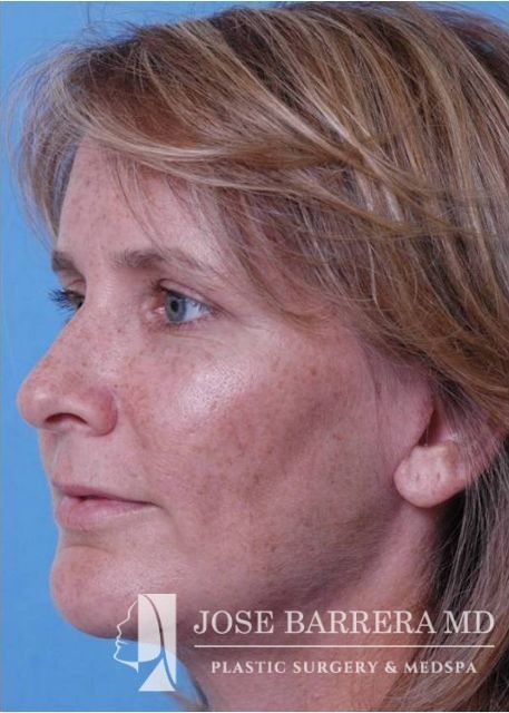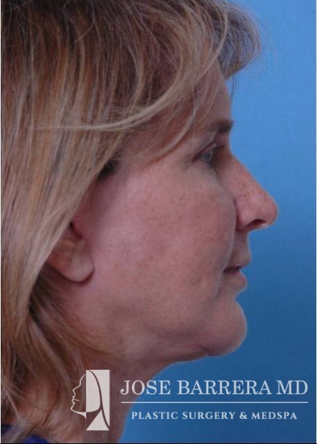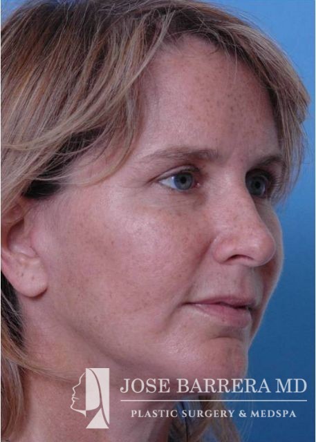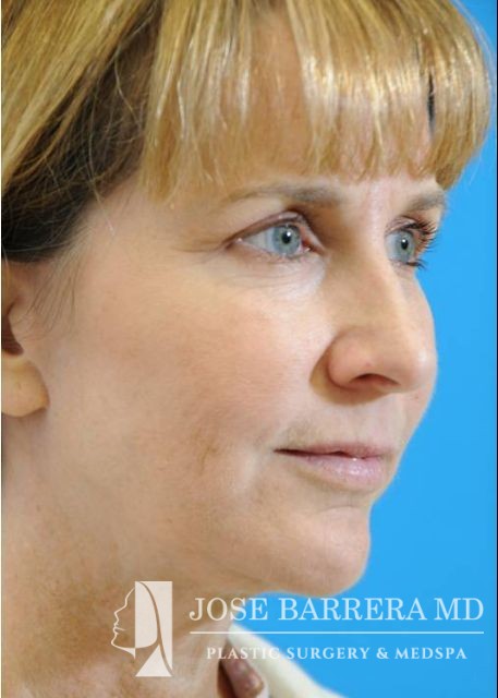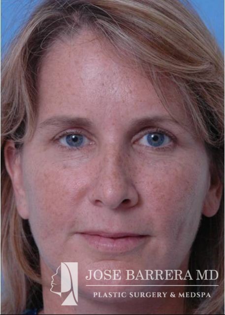 This patient underwent SMAS facelift, endoscopic browlift and CO2 laser skin resurfacing with the Lumenis Active and Deep FX laser. She presented with significant hyperpigmentation, jowling, and solar elastosis which is improved after surgery.