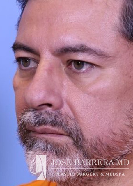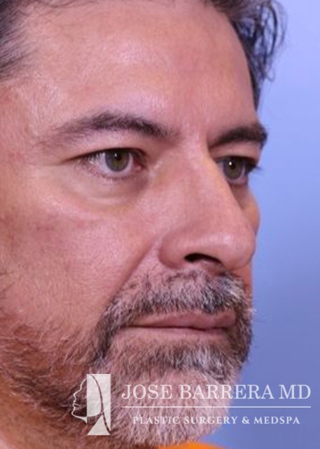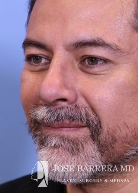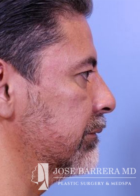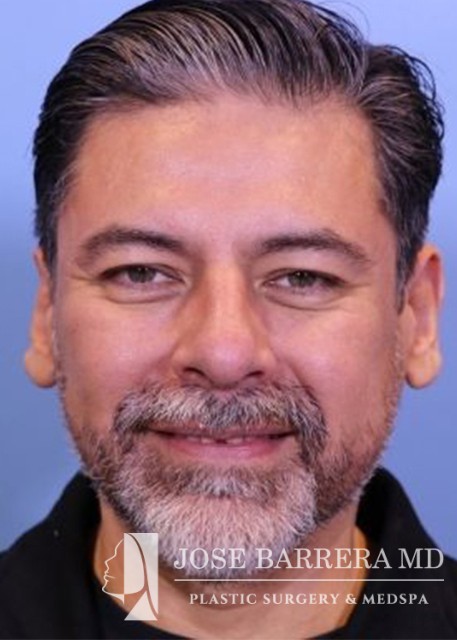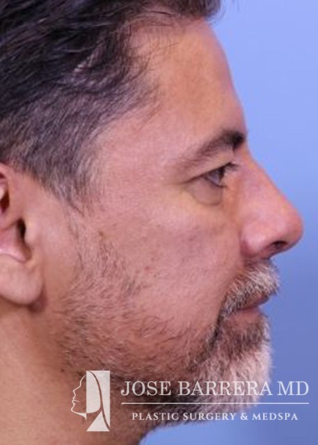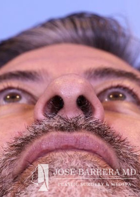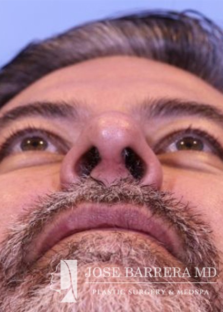 49-year-old male presents for initial consultation for rhinoplasty. He had trauma and a broken nose and it was never fixed. He has had a crooked nose since. He has trouble breathing out his nose. A septorhinoplasty and ultrasonic rhinoplasty was performed. The left upper lateral cartilage was sharply divided from the septum on the caudal edge for placement of a spreader graft to open the nasal valve. The spreader was then placed along the septum right medial to the upper lateral cartilages and this was secured to the septum with multiple 5-0 prolene mattress sutures. A septal extension graft was placed and secured to the caudal septum with 3-0 prolene. The patient’s septal and boney hump was identified. The septal portion was removed with a 15 blade scalpel and the bony hump taken down sharply with a Piezo diamond rasp. He is 3 months postop