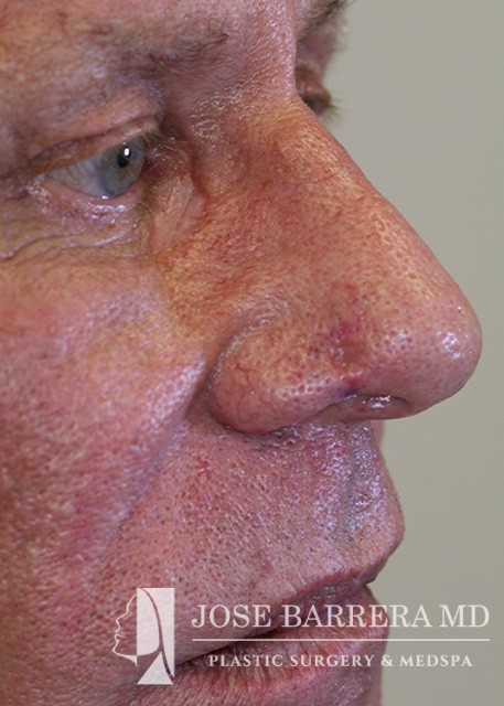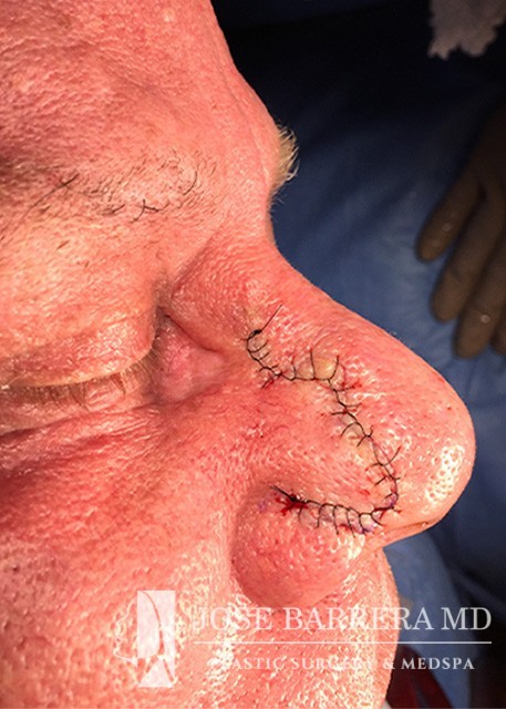 Nasal reconstruction cases have two stages after the skin cancer is removed. First the Inner lining using mucosal flaps is performed, followed by a cartilage reconstruction using either septum or rib, then a paramedian forehead flap. The second stage is the paramedian forehead flap takedown with tapering of the forehead donor site and refinement of the nasal flap.