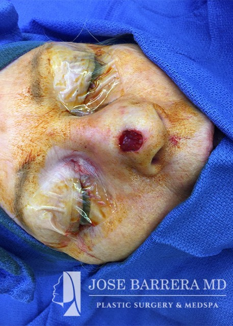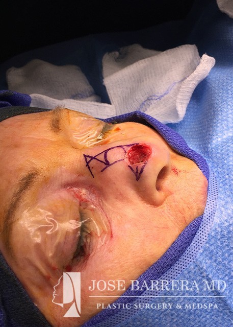 Nasal reconstruction cases have two stages after the skin cancer is removed. First the Inner lining using mucosal flaps is performed, followed by a cartilage reconstruction using either septum or rib, then a paramedian forehead flap. The second stage is the paramedian forehead flap takedown with tapering of the forehead donor site and refinement of the nasal flap.