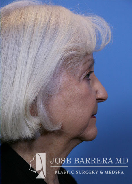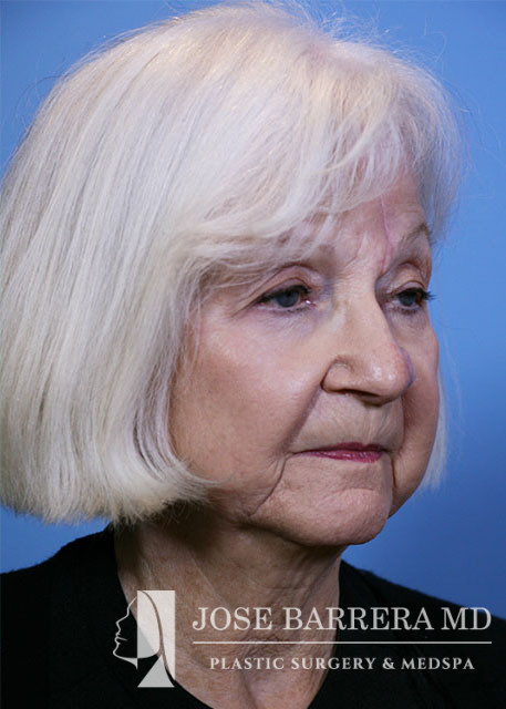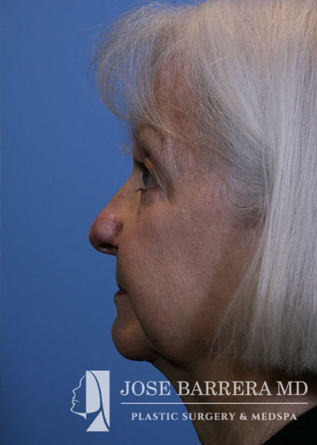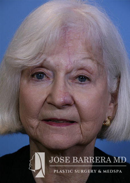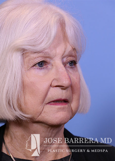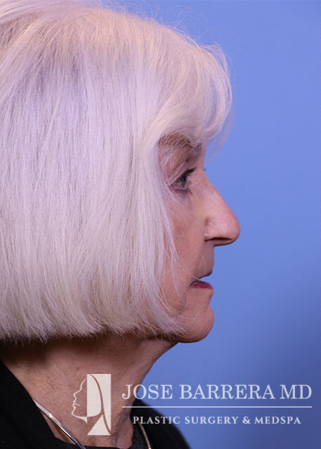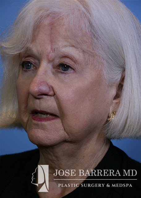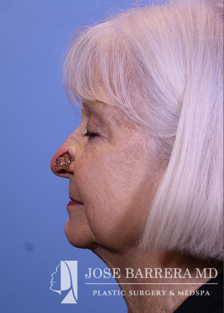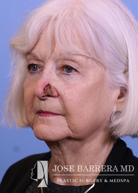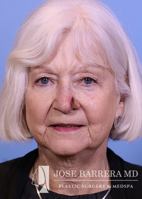 81-year-old female that presents for Moh’s resection of the left nasal ala, side wall, and tip. This was poorly differentiated SCC. She was referred by her Moh’s surgeon for reconstruction. She has never had previous head and neck surgery. She underwent a paramedian forehead flap, auricular cartilage graft, and costal cartilage graft for reconstruction and is 3 months postop.