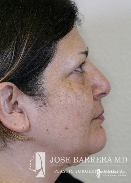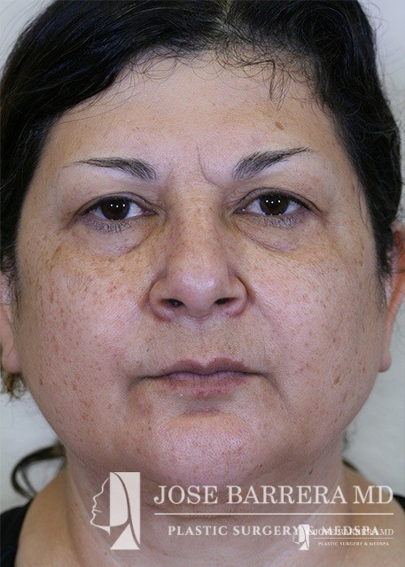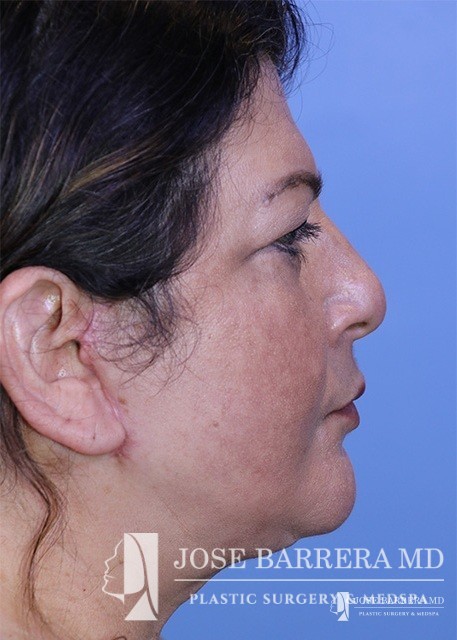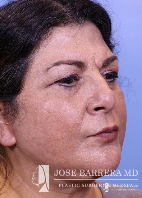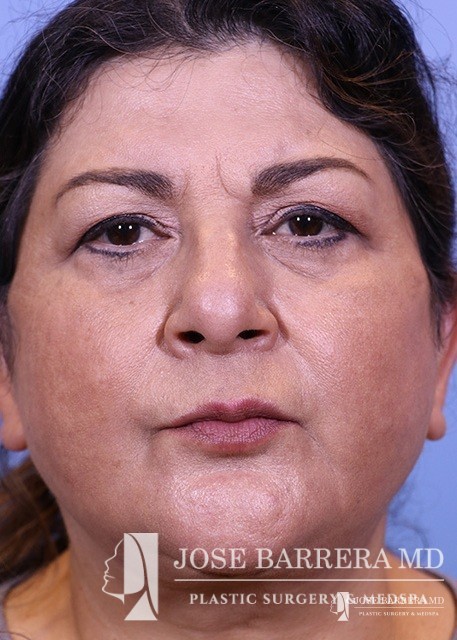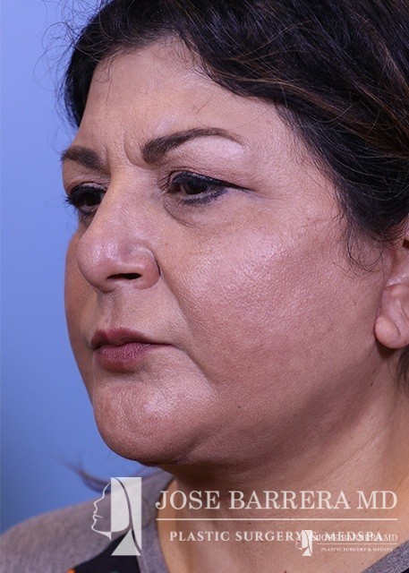 The patient presented with a heavy neck and facial fullness. She had extensive skin creepiness in the neck. A necklift was performed with platysmaplasty to improve the neck bands.
