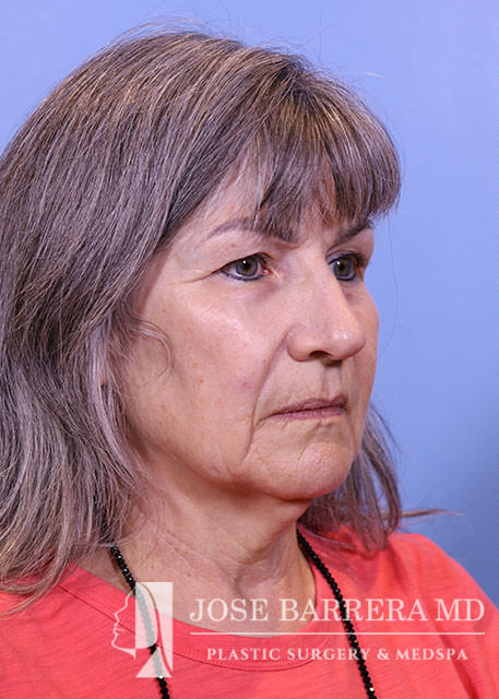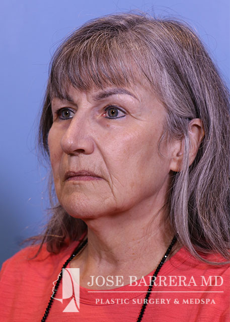 58-year-old female presenting today in consultation for cosmetic aging face concerns. Patient expresses concerns regarding forehead rhytids, marionette lines, facial rhytids, brow ptosis, upper lid dermatochalasis, prominent tear troughs, jowling, neck laxity. She had a Deep plane face, neck rhytidectomy, and Full face CO2 laser resurfacing. She is 2 months postop and healing well.