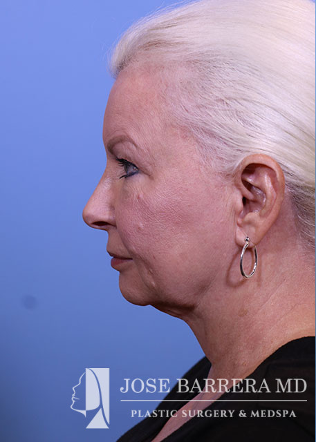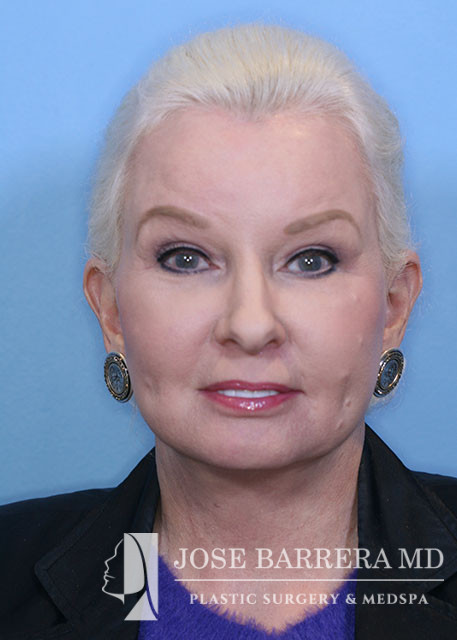 69-year-old female presenting today in consultation for cosmetic aging face concerns. Patient expresses concerns regarding facial rhytids, brow ptosis, upper lid dermatochalasis, jowling, neck laxity. The patient underwent Deep plane facelift, neck lift, endoscopic brow lift, upper eyelid blepharoplasty, and CO2 laser resurfacing to the entire face with Dr. Barrera