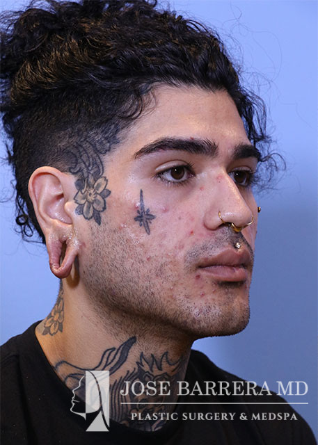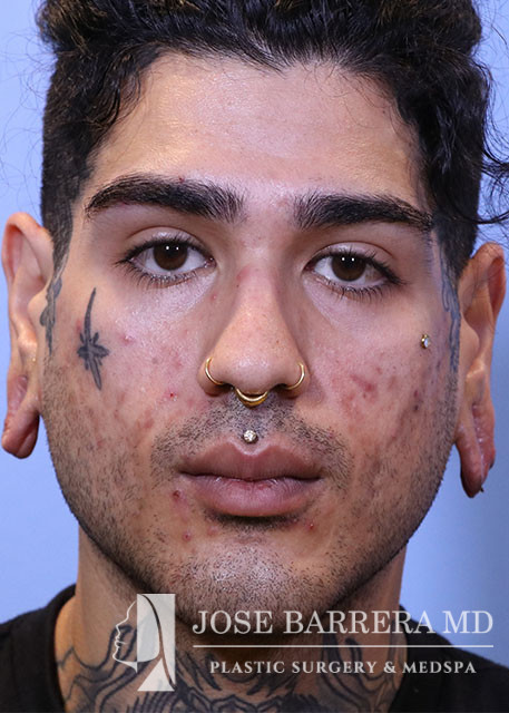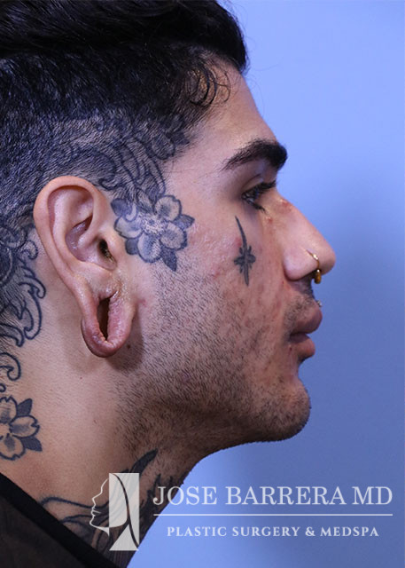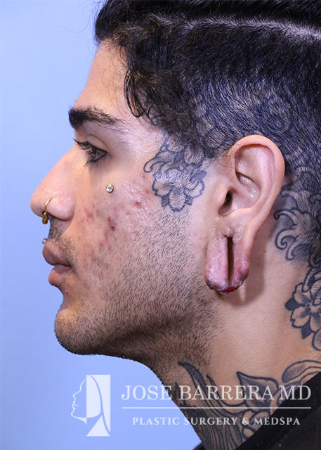 The patient was brought to the procedure room and identified by name and date of birth. Written informed consent was obtained. 1% lidocaine with 1:100,000 epinephrine was injected into bilateral ear lobes. The ear lobes were prepped and draped. The skin lining the torn lobe was excised both anteriorly and posteriorly. The anterior aspect of the gauged ear lobe was truncated about 5mm from the attachment to the face. The posterior limb of the gauged ear lobe was rotated anteriorly, excess skin and soft tissue was excised, and the posterior limb of the gauged ear lobe was attached to the stump from the anterior limb and the inferior aspect of the auricle. Deep 5-0 chromic suture was placed to reapproximate the edges of the torn ear lobe. Interrupted 5-0 chromic placed to reapproximate the skin both anteriorly and posteriorly. The same procedure was repeated for the other side.
