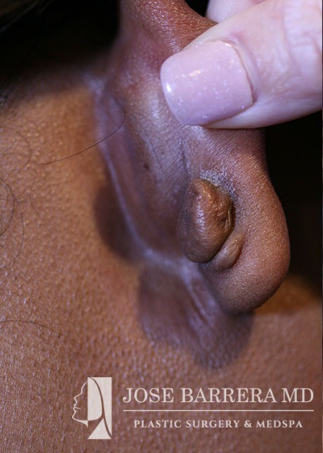 37-year-old female who presented with a large keloid in her right ear lobe. The keloid occurred due to trauma from a piercing. Dr. Barrera removed the keloid and used kenalog to keep from coming back.