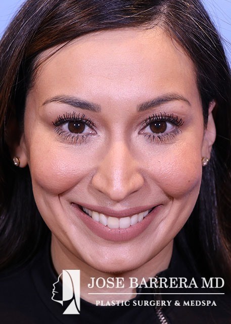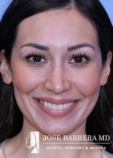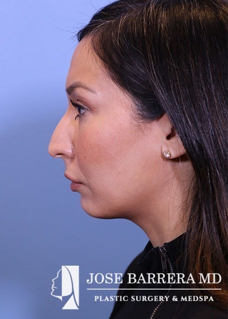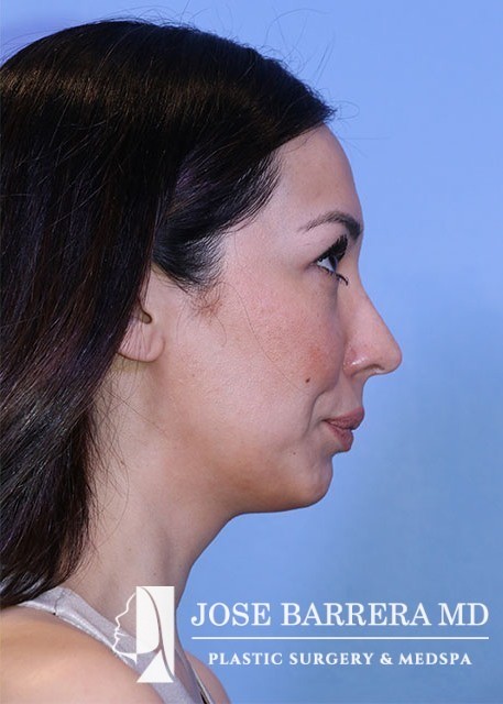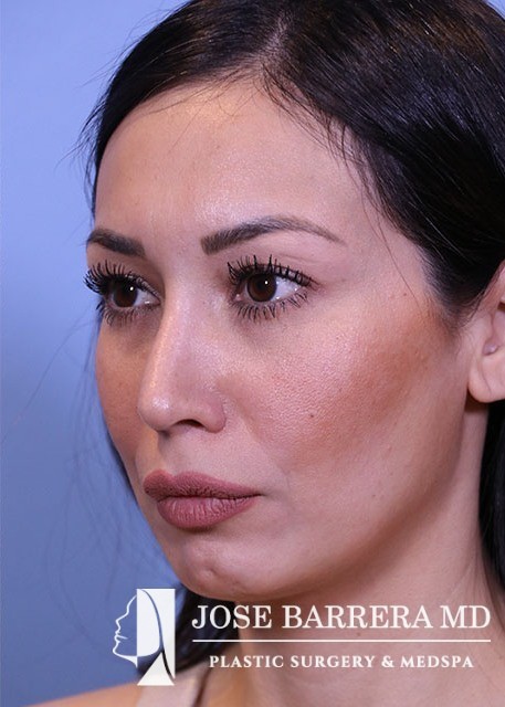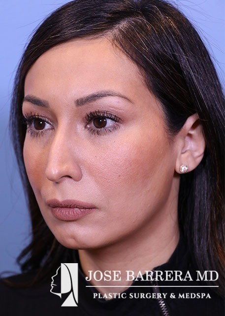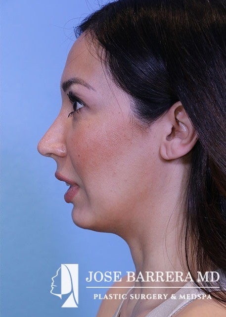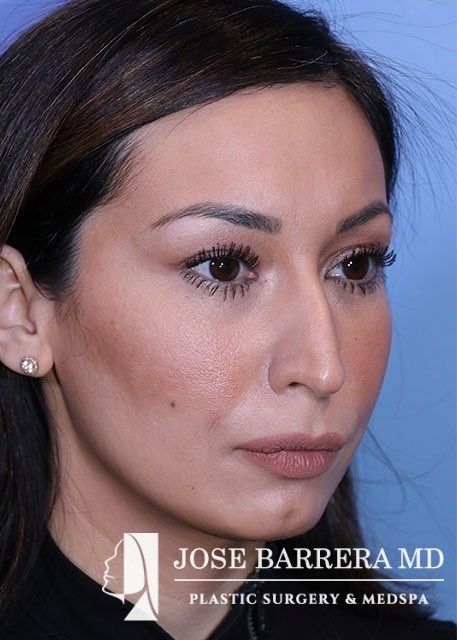 33-year-old female who presented with a dorsal hump and acute nasal labial angle. She wanted improvement in her dorsum and nasal tip. Dr. Barrera performed a modified subdorsal preservation rhinoplasty with placement of a septal extension graft. The patient is only 3 months postoperative but the improvements can be readily seen.