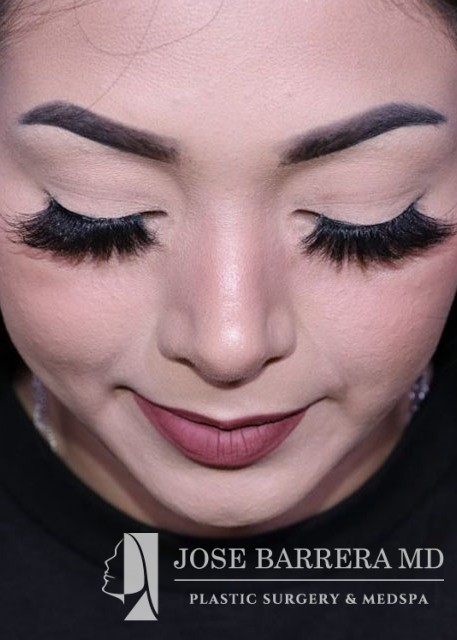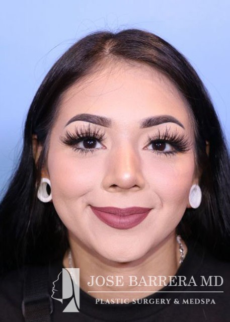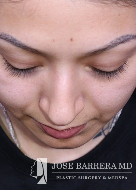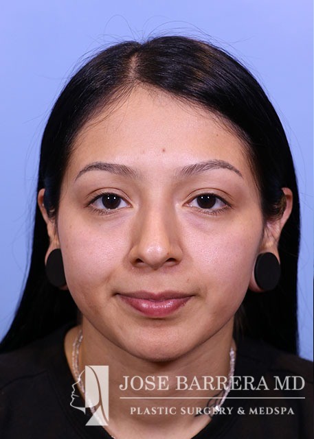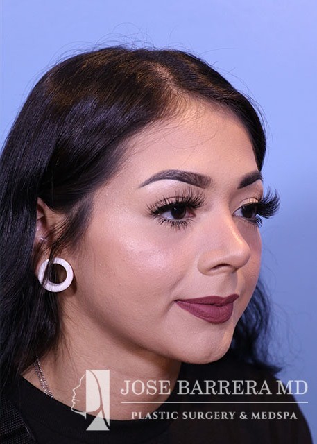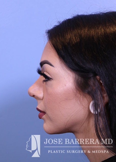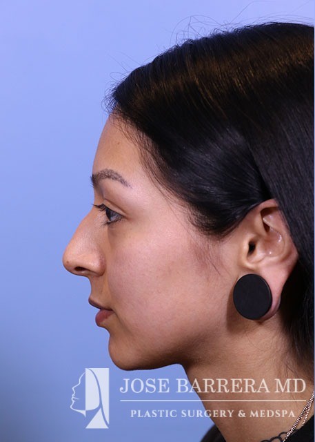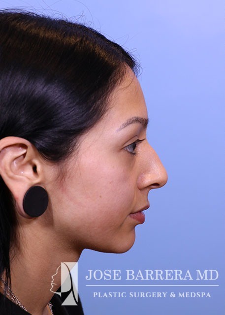 21-year-old female with a dorsal hump and nasal tip droop. She presented to Dr. Barrera for preservation rhinoplasty. Dr. Barrera performed ultrasonic rhinoplasty for a modified cottle manuever. The tip was elevated using a septal extension graft and was refined with cranial sutures.