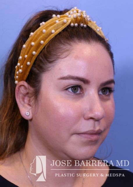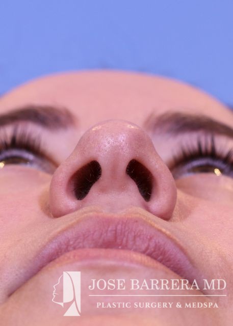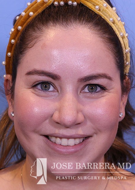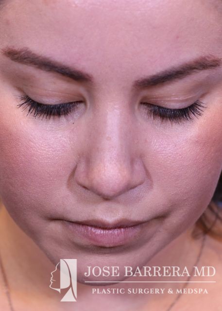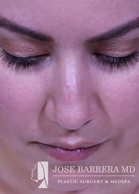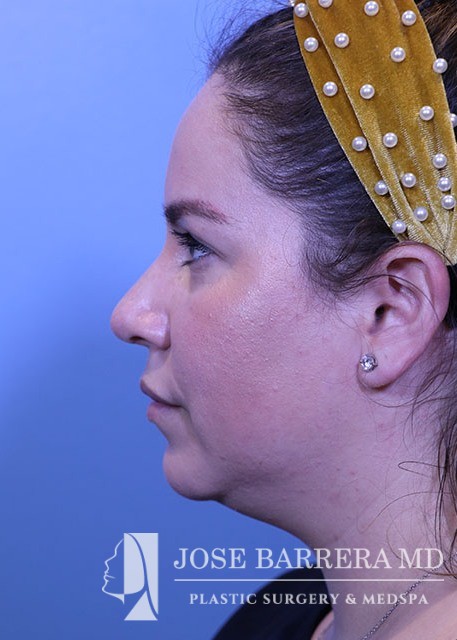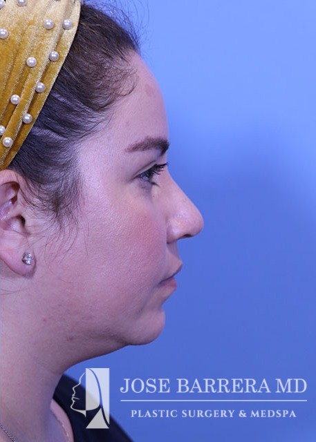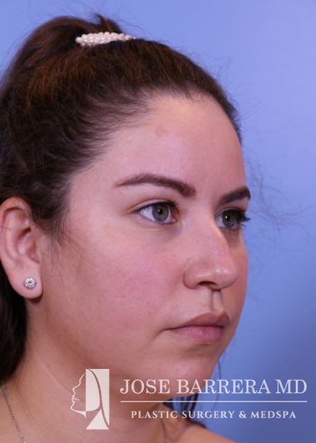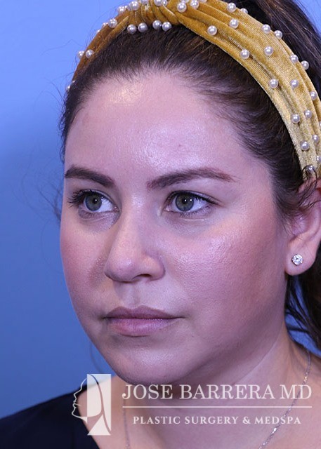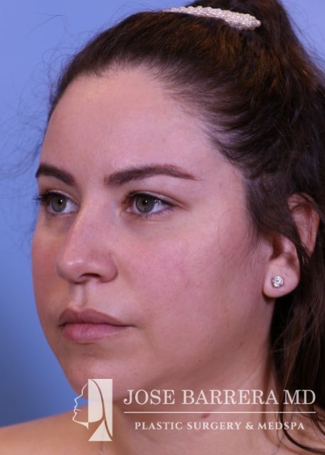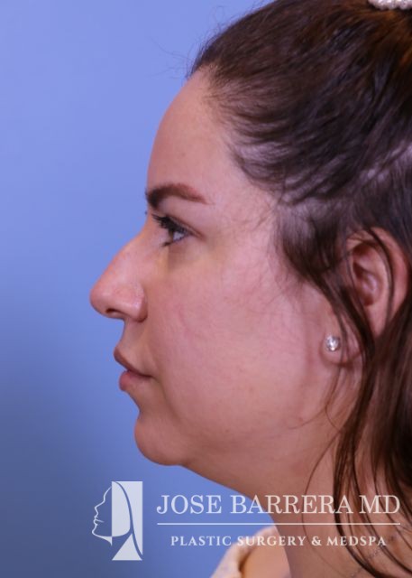 32-year-old female with a kyphotic dorsal hump and nasal tip ptosis. She wanted improvement in the hump and refinement of the nasal tip. Dr. Barrera performed a dorsal preservation rhinoplasty and tip refinement using a septal extension graft.
