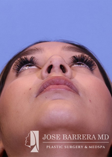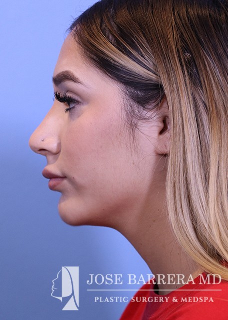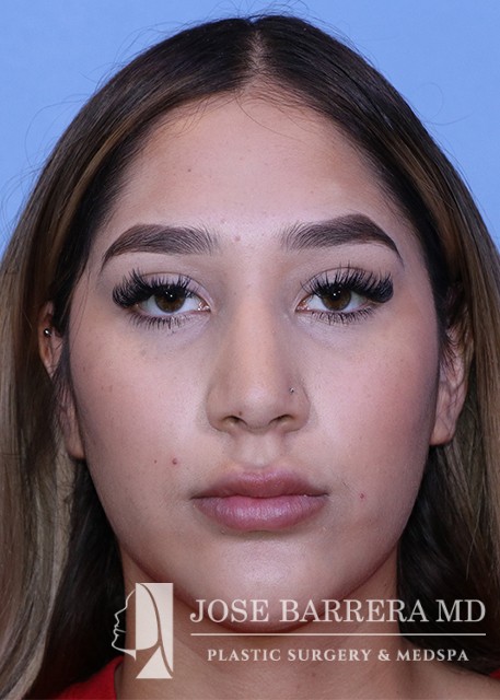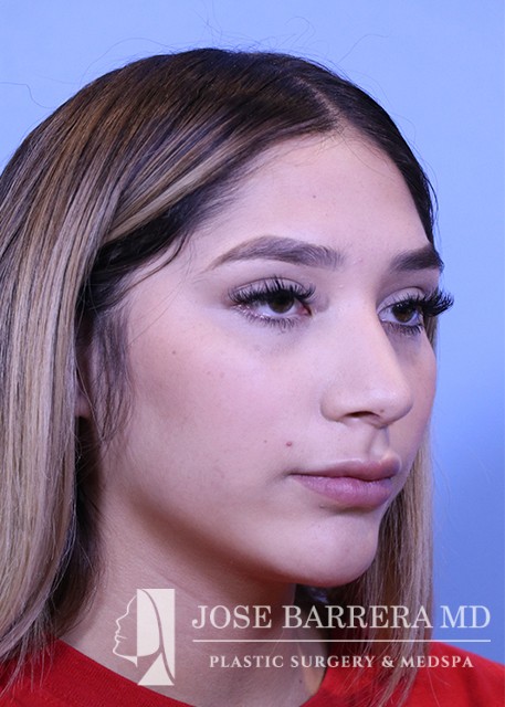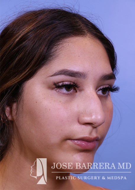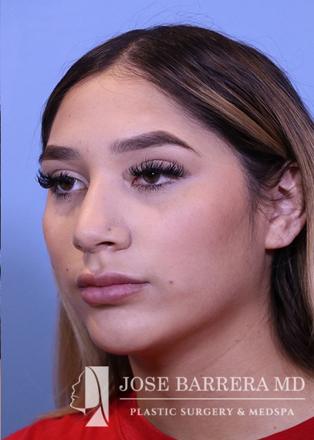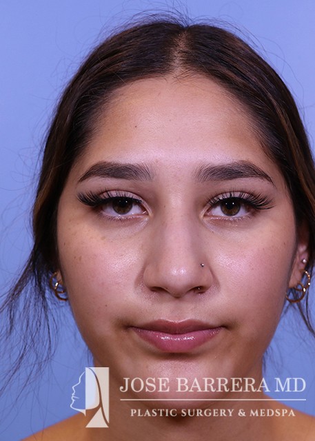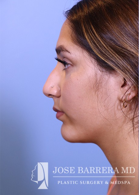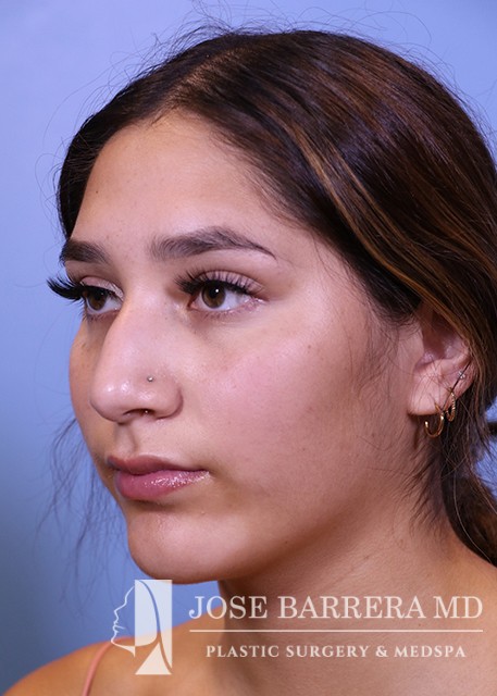 Our patient underwent a preservation rhinoplasty with Dr. Barrera. A high strip and low strip modified Z flap was used with piezo directed ultrasonic rhinoplasty and septal extension graft to achieve these results. She is 12 months postoperative from her rhinoplasty.
