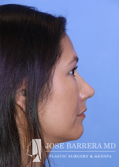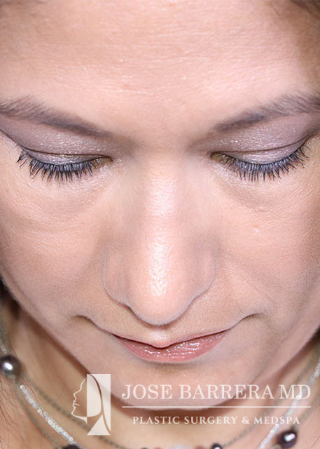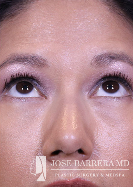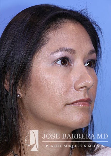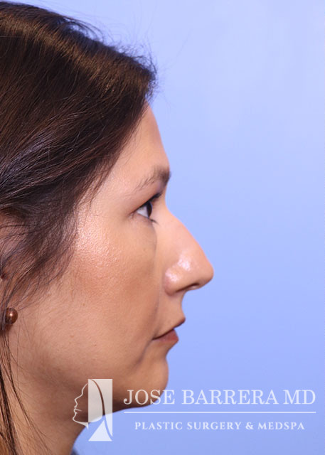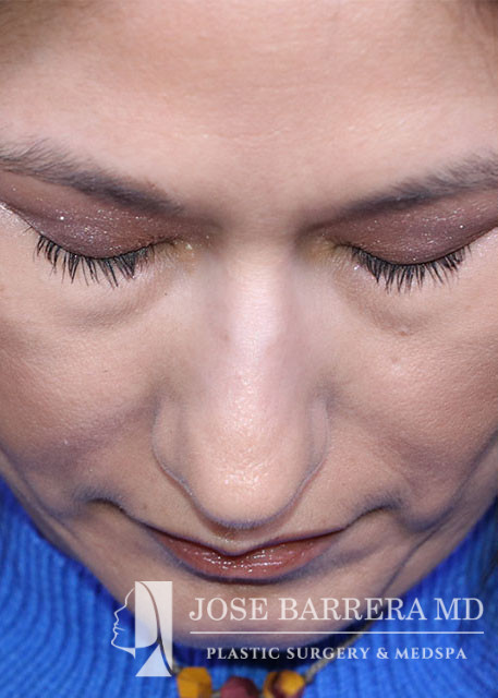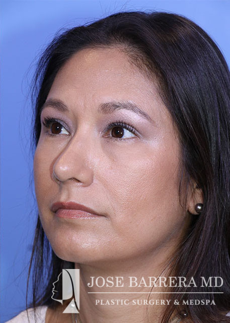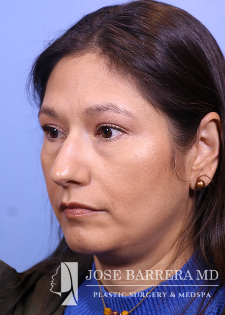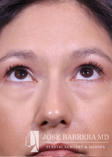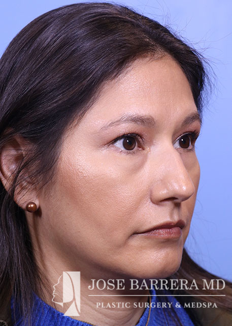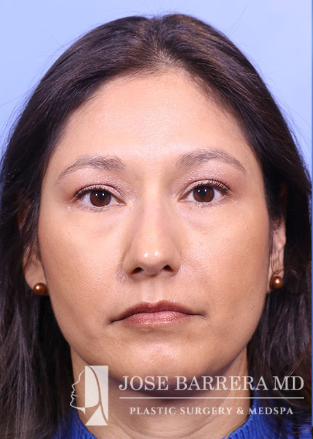 46-year-old female presenting with eyelid and aesthetic nasal concerns. Patient desires dorsal hump reduction, increased tip rotation for a ptotic nasal tip, and tip refinement. The patient also expresses concern regarding tired appearing eyes and deep tear trough region. The patient reports she underwent facial filler injection in 2018 which she feels left lower eyelid watery edema. The patient also notes she has struggled with dry eyes in the past. She underwent a Primary cosmetic preservation rhinoplasty with septal cartilage grafting (left SEG, left dorsal crushed cartilage graft); turbinoplasty, and lower blepharoplasty with fat transpositon (central and medial fat transposed, lateral fat pad reduced). She looks amazing!