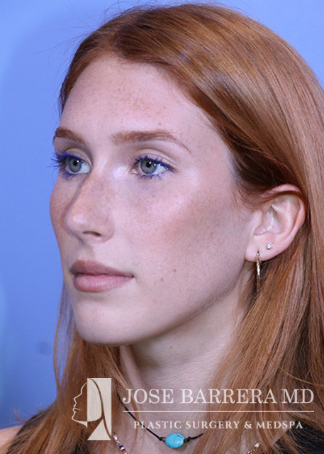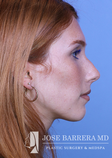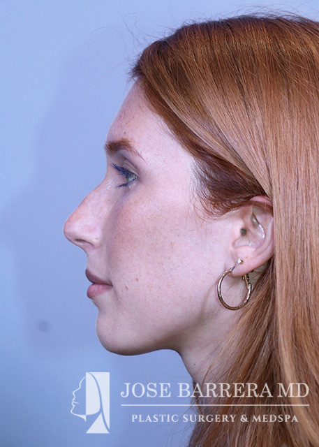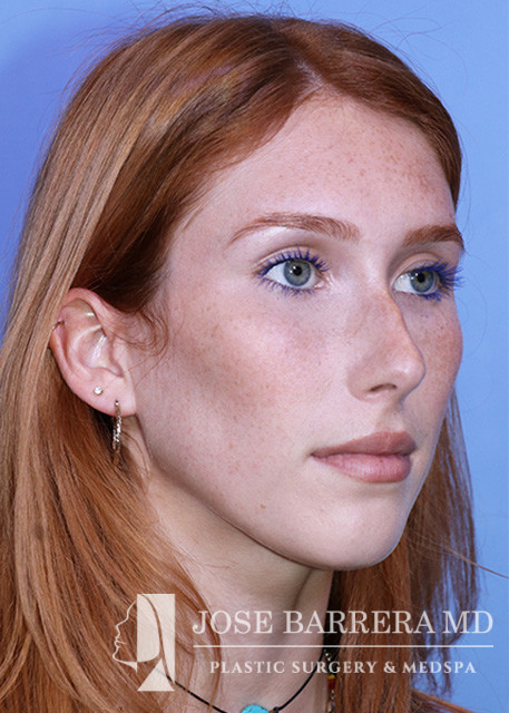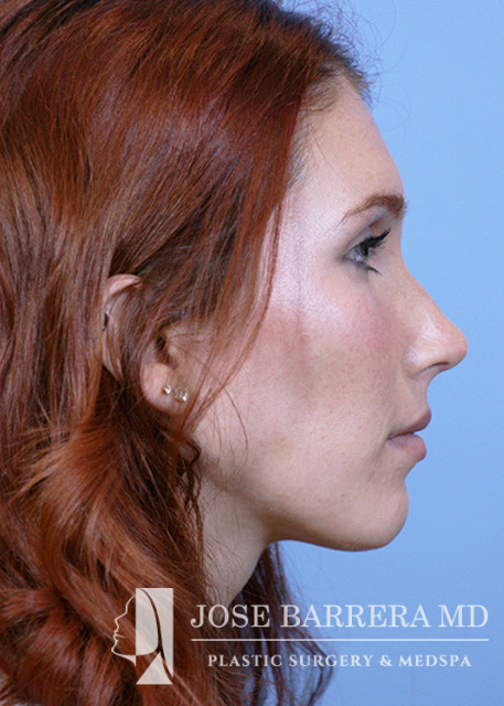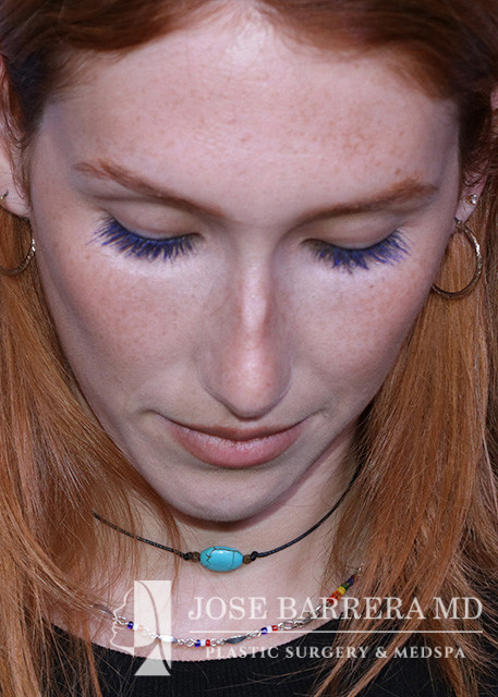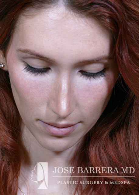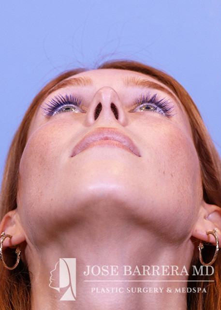 Inferior septal cartilage was harvested in one piece with care taken to maintain greater than 1.5 cm L strut. The anterior left upper lateral cartilage was released from the septum. Cephalic trims were performed leaving 8mm wide lower lateral cartilages and releasing the scroll. A septal extension graft was fashioned from the harvested septal cartilage and secured to the maxillary crest and left side of the native septum with 4-0 PDS and 5-0 prolene. 5-0 prolene dome spanning and lateral crural tensioning sutures were placed to create new domes and increase rotation, securing the lower lateral cartilages to the septal extension graft. The skin was elevated off the medial crura. A tongue-and-groove procedure was performed and the medial crura were sutured to the caudal septum with 5-0 prolene. Medial crural fixation sutures were placed to secure the medial crura together and narrow the columella. The patient is shown 6 months post-op.