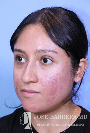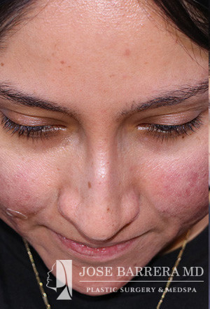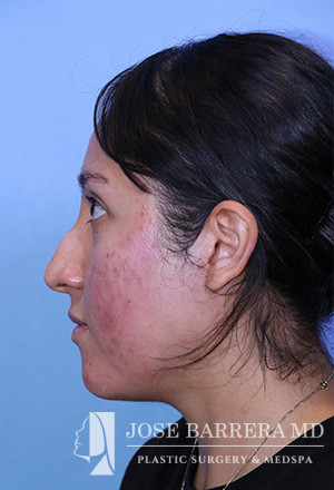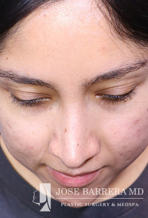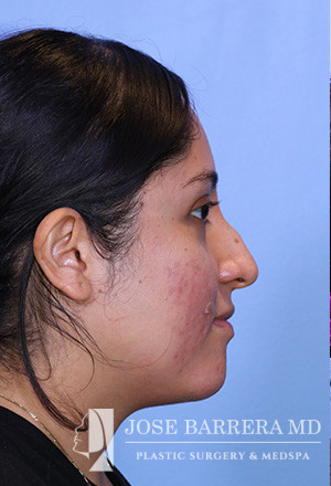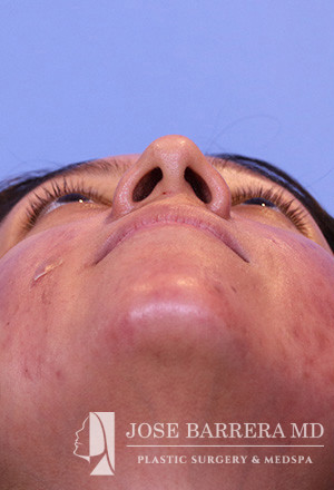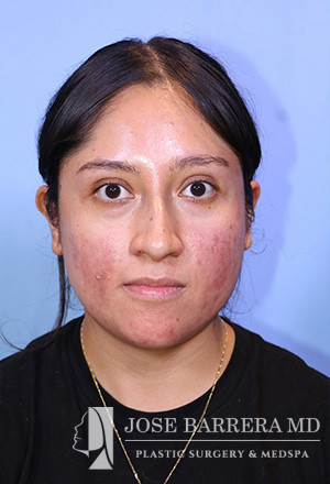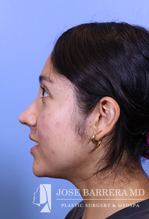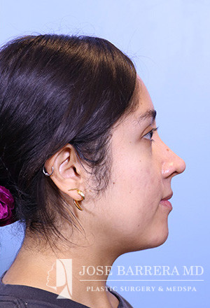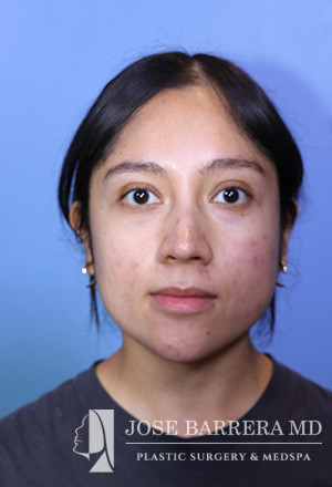 28-year-old female presenting today in consultation regarding aesthetic nasal concerns. The patient desires dorsal hump reduction, increased tip rotation for a ptotic nasal tip, tip refinement, narrowed nasal dorsum, and straightened nasal pyramid . The patient also endorses bilateral nasal obstruction (R>L). She underwent a modified Z flap preservation rhinoplasty with septal cartilage grafting (right SEG; right spreader graft) and nasal SMAS flap